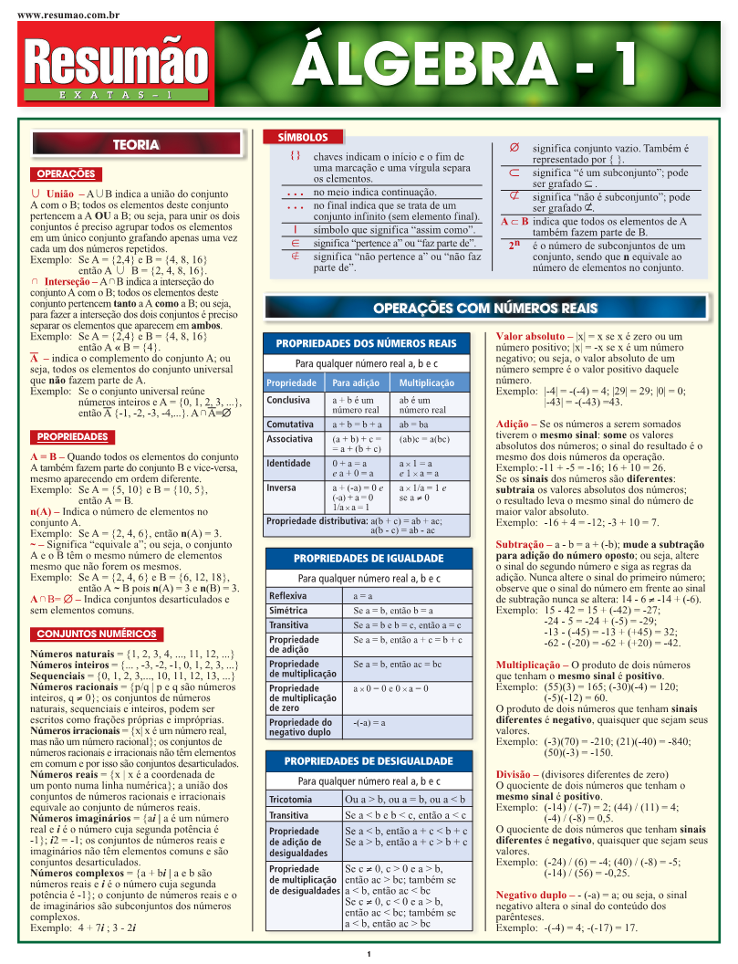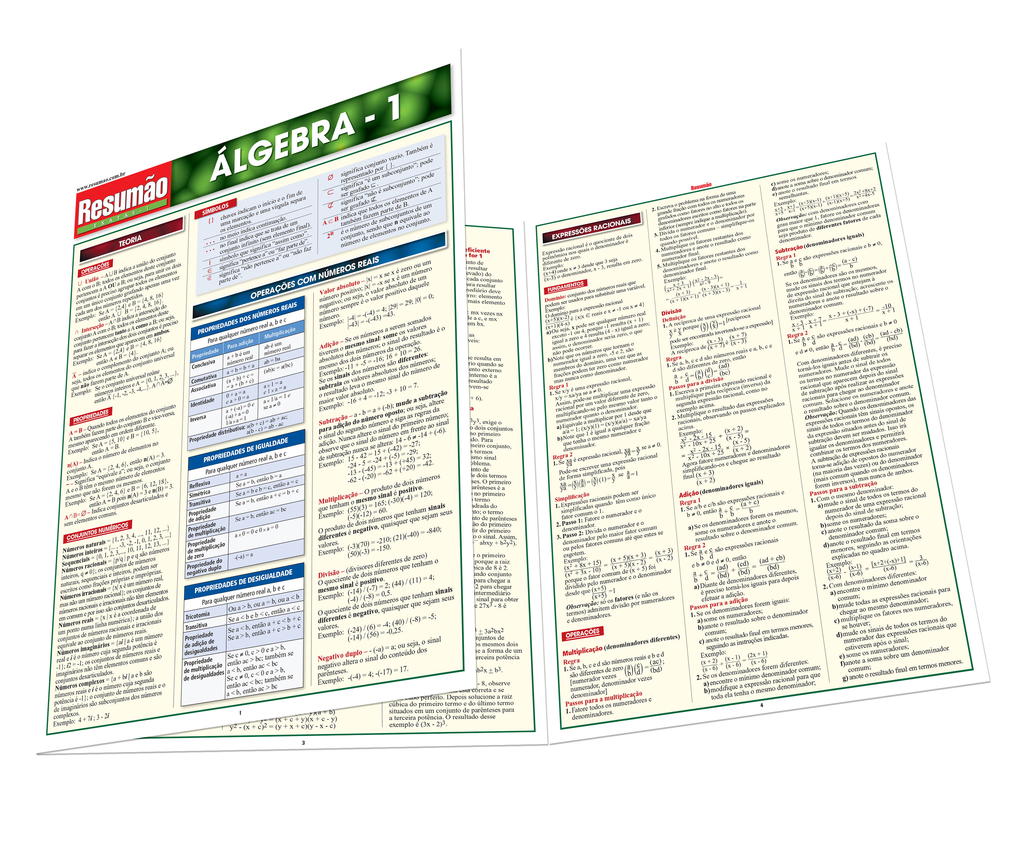 Propriedades dos números reais. Operações com números reais. Termos algébricos: adição ou subtração de termos semelhantes, multiplicação e divisão. Resolução de equações de primeiro grau com uma variável. Inequações de primeiro grau com uma variável. Ordem das operações. Fatoração. Expressões racionais. Divisão de polinômios. Expressões racionais e expressões radicais em equações. Equação quadrática. Números complexos. Raízes e radicais. Os dois títulos de Resumão de Álgebra (1 e 2) cobrem os pontos mais importantes dessa complexa matéria.