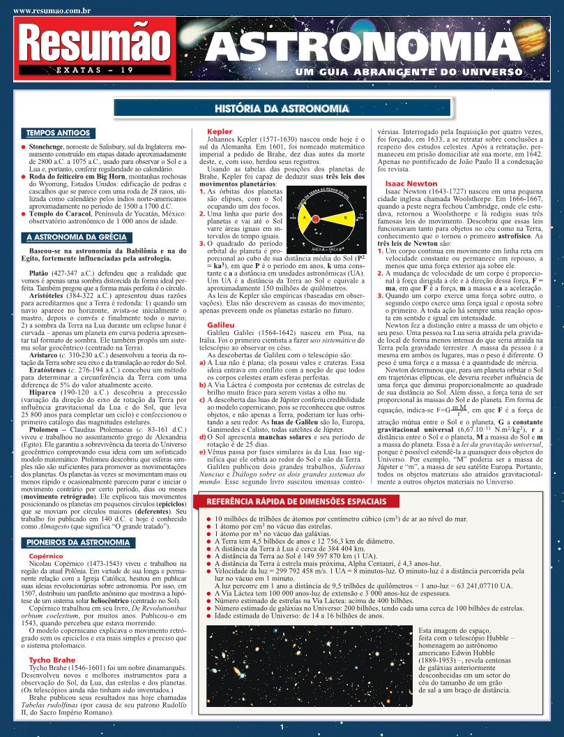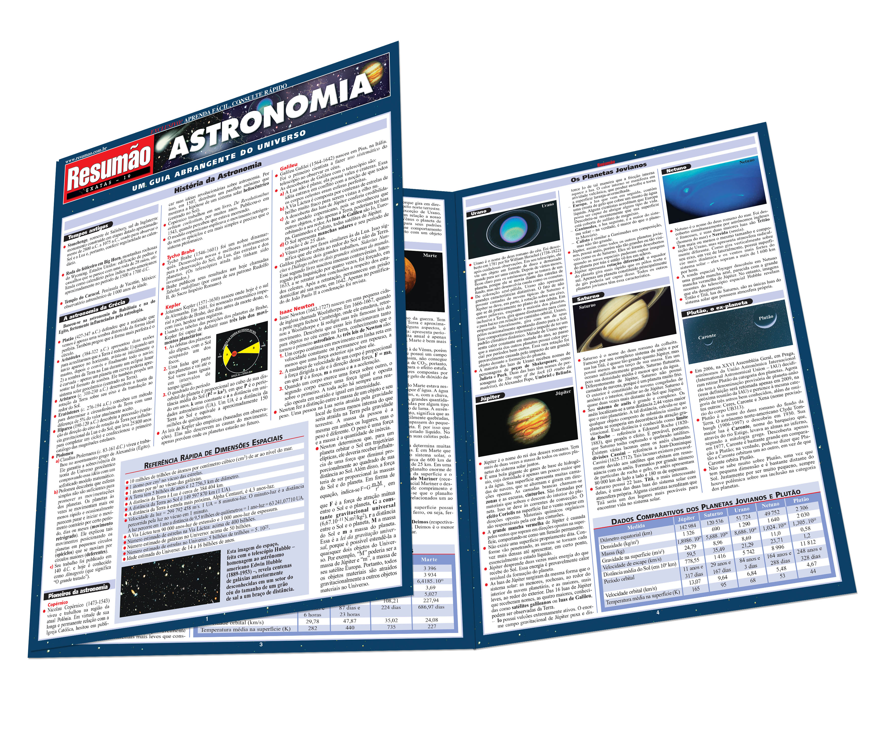 Um guia abrangente do universo. História da astronomia: tempos antigos; a astronomia da Grécia e os pioneiros da astronomia (Copérnico, Tycho Brahe, Kepler, Galileu, Newton). O sistema solar. Os planetas terrestres/telúricos (Terra, Mercúrio, Vênus, Marte). Os planetas jovianos e Plutão (Urano, Júpiter, Saturno, Netuno). O sol. As estrelas (propriedades das estrelas, luz das estrelas). Galáxias. Conceitos de cosmologia. E mais: quadros com referência rápida de dimensões espaciais; dados comparativos dos planetas terrestres; dados comparativos dos planetas jovianos e Plutão; relação de satélites de planetas.