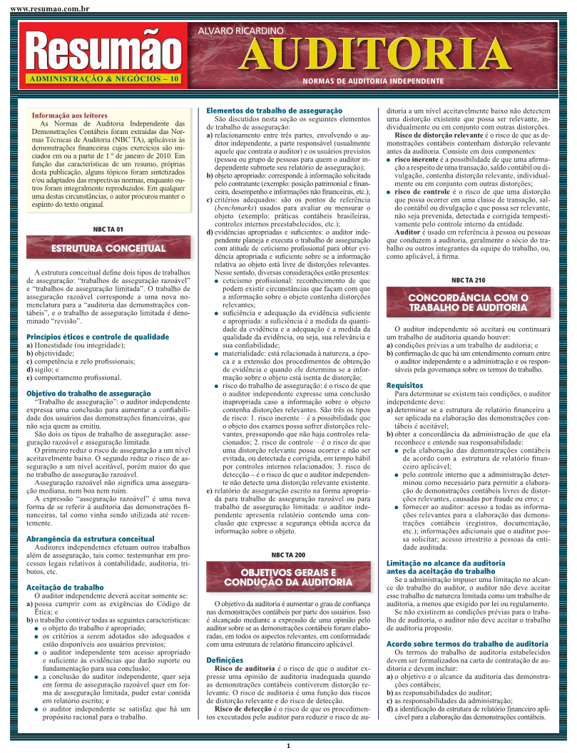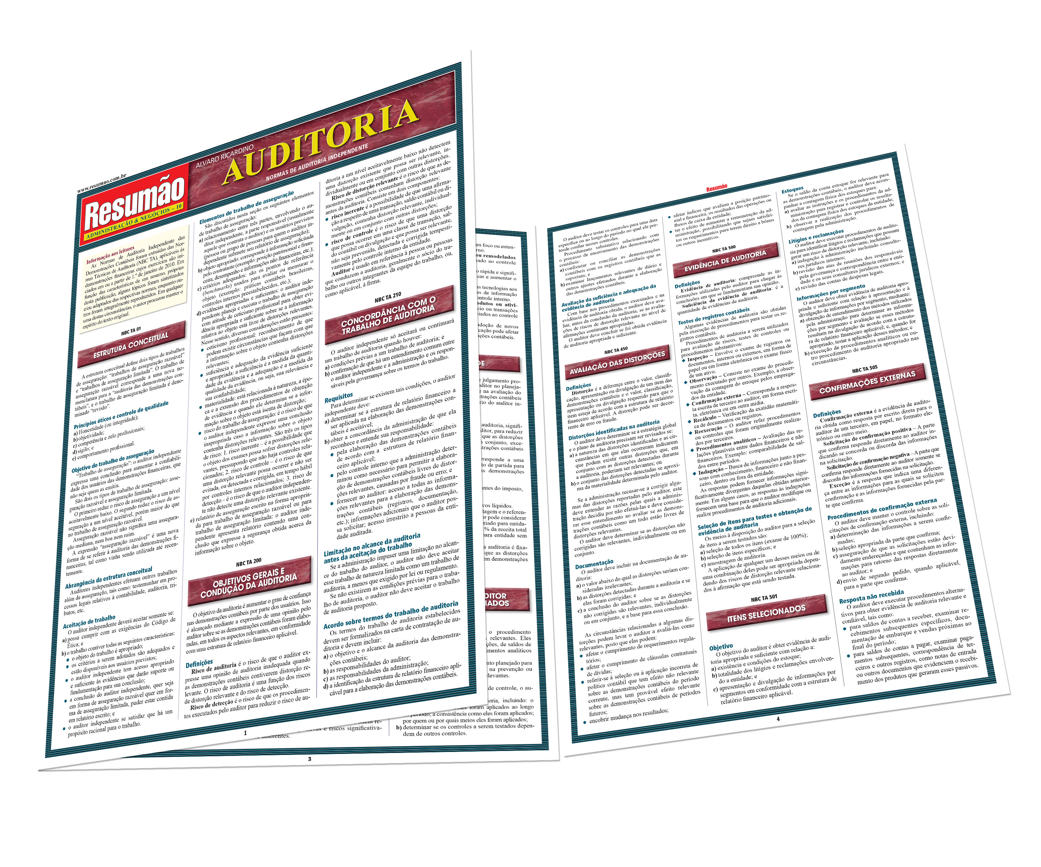 As normas de auditoria independente das demonstrações contábeis: conceituação e disposições gerais. Papéis de trabalho e documentação. Fraude e erro. Planejamento. Relevância. Risco de auditoria. Supervisão e controle de qualidade. Estudo e avaliação do sistema contábil e de controles internos. Aplicação dos procedimentos. Continuidade das atividades. Amostragem. Processamento eletrônico de dados. Estimativas contábeis. Transação com partes relacionadas. Contingências. Transações e eventos subsequentes. Parecer dos auditores independentes sobre as demonstrações contábeis.