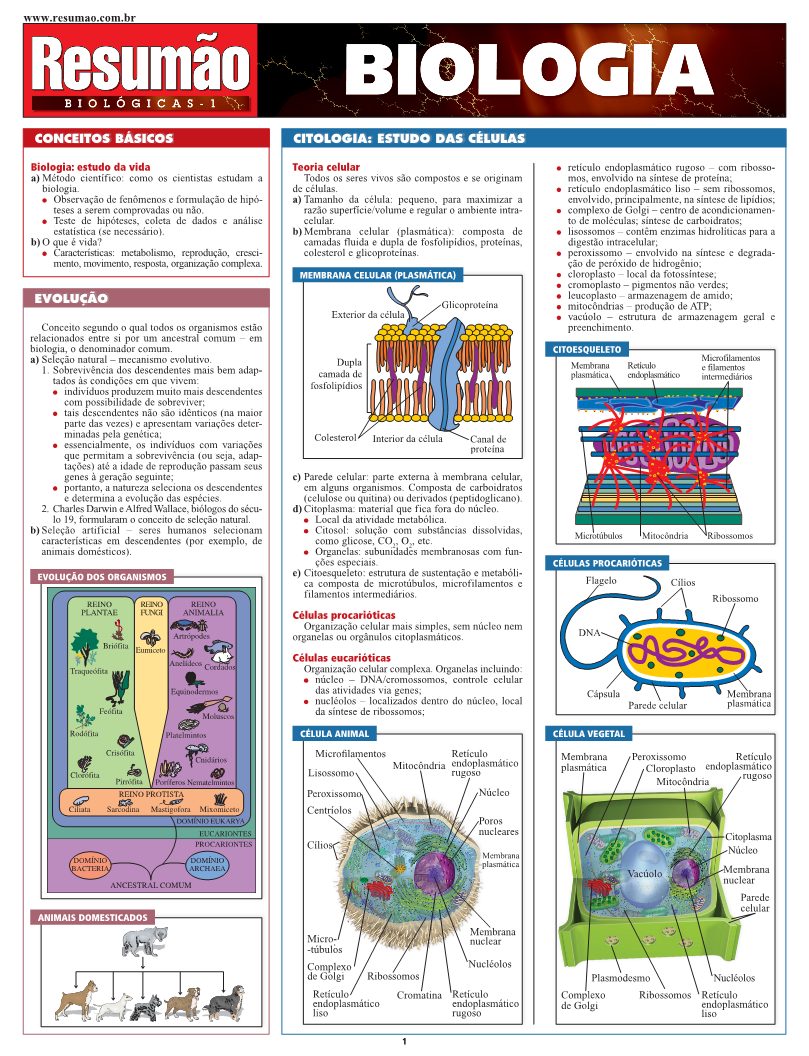 Conceitos básicos de biologia. Evolução. O estudo das células. Energia e vida; sol, fotossíntese, respiração celular. Transporte celular. Reprodução celular, ciclo celular e mitose. Reprodução orgânica e meiose: processo sexual, gametogênese vegetal e animal. Genética & Mendel. Lei da Segregação dos Fatores. Lei de Segregação Independente. Cromossomos e determinação do sexo. Genética molecular: genes, DNA e ácido nucleico. Genética das populações; genes em populações versus indivíduos, o equilíbrio de Hardy-Weinberg, Hardy-Weinberg e as populações naturais.