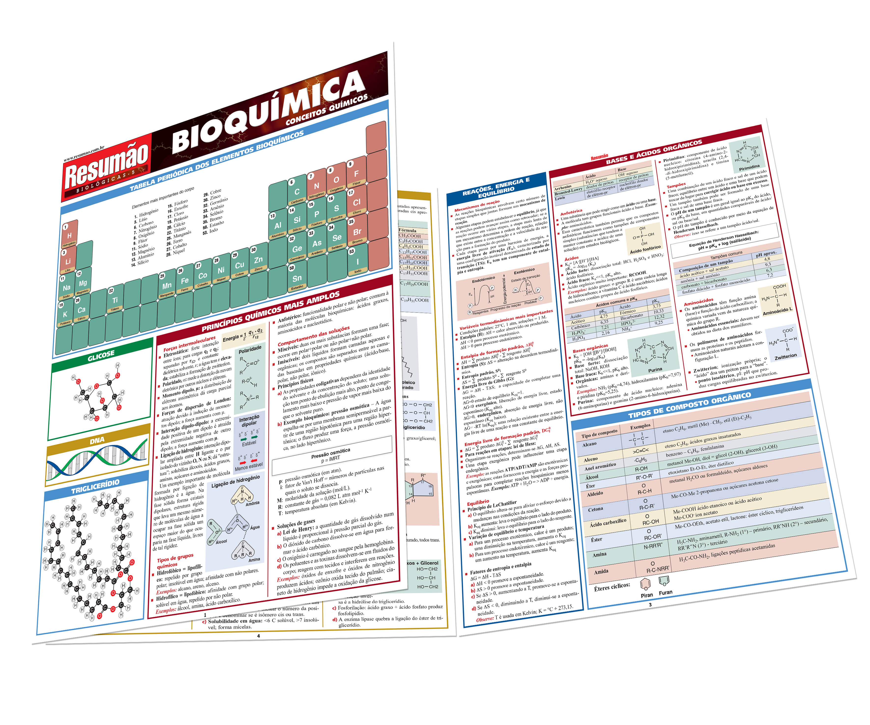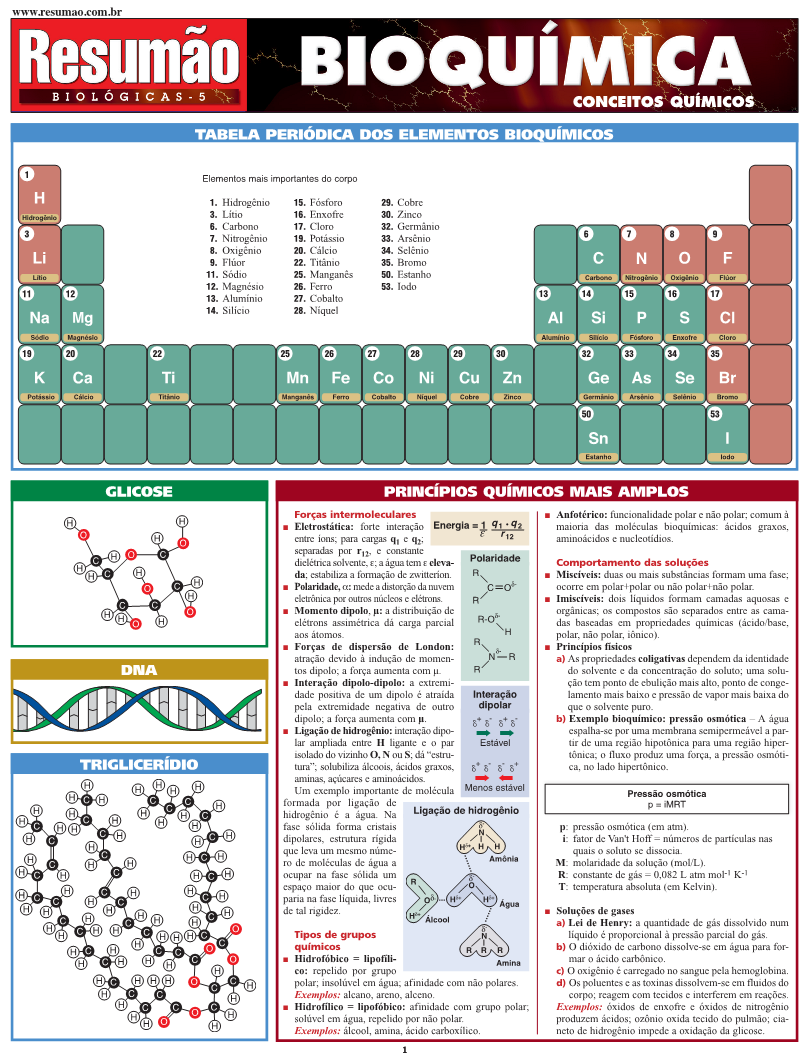 Tabela periódica dos elementos bioquímicos. Princípios químicos mais amplos. Glicose. DNA. Triglicerídio. Ligações e estrutura dos compostos orgânicos. Cinética: velocidade das reações químicas. Principais tipos de reação química. Reações, energia e equilíbrio. Bases e ácidos orgânicos. Tipos de composto orgânico. Compostos bioquímicos: carboidratos, gorduras e lipídios, proteínas e peptídios, ácidos nucleicos. Aminoácidos comuns. Abreviações usadas em biologia e bioquímica. | Autor: Mark Jackson, Ph.D.