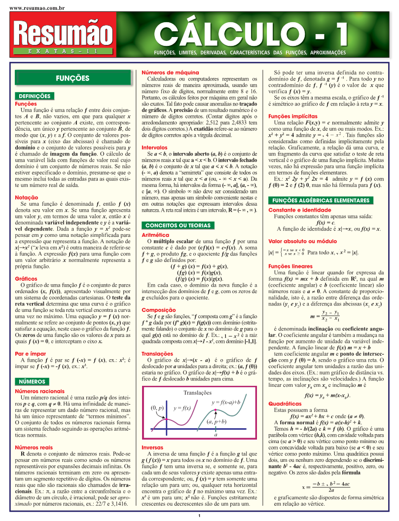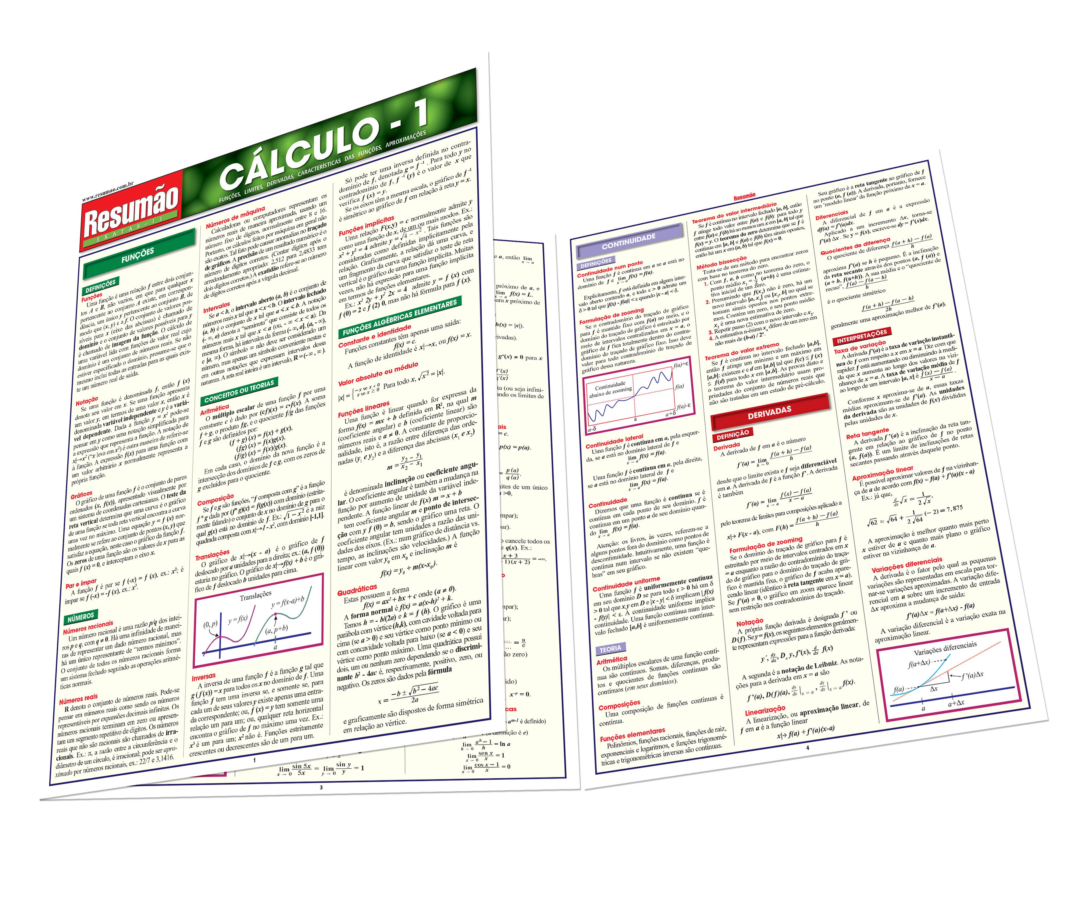 Funções: definições, números, conceitos, teorias, funções algébricas elementares, exponenciais e logaritmos, funções trigonométricas. Limites: teoremas, fórmulas. Continuidade: definições e teoria. Derivadas: interpretações, aplicações, regras de derivação e fórmulas de derivação. Análise: características locais de funções, tendências e características, aplicações. Integração, interpretações, Teorema Fundamental do Cálculo (TFC). Cálculo 1 com os títulos Cálculo 2 e Métodos de Cálculo são ferramentas de consulta essenciais para estudantes, professores e engenheiros.
