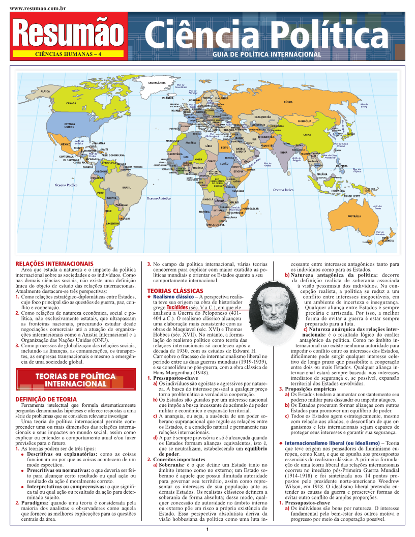 Relações internacionais. Teorias de política internacional. Definição de teoria, teorias clássicas: realismo clássico, internacionalismo liberal, marxismo. Teorias contemporâneas: neorrealismo, pluralismo e neoliberalismo, construtivismo, escola inglesa, teorias da globalização. Três níveis de análise. Agentes da política internacional. Guerra. Sistema internacional moderno. Direito internacional. Política econômica internacional. Nações Unidas. Controle internacional de armas.