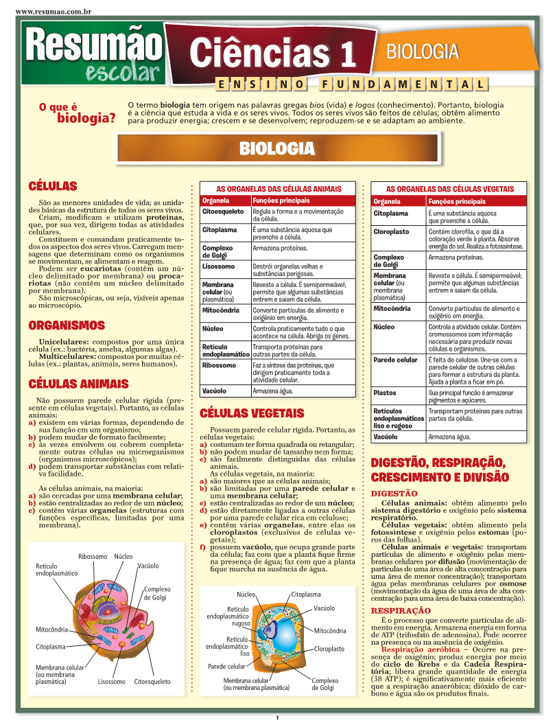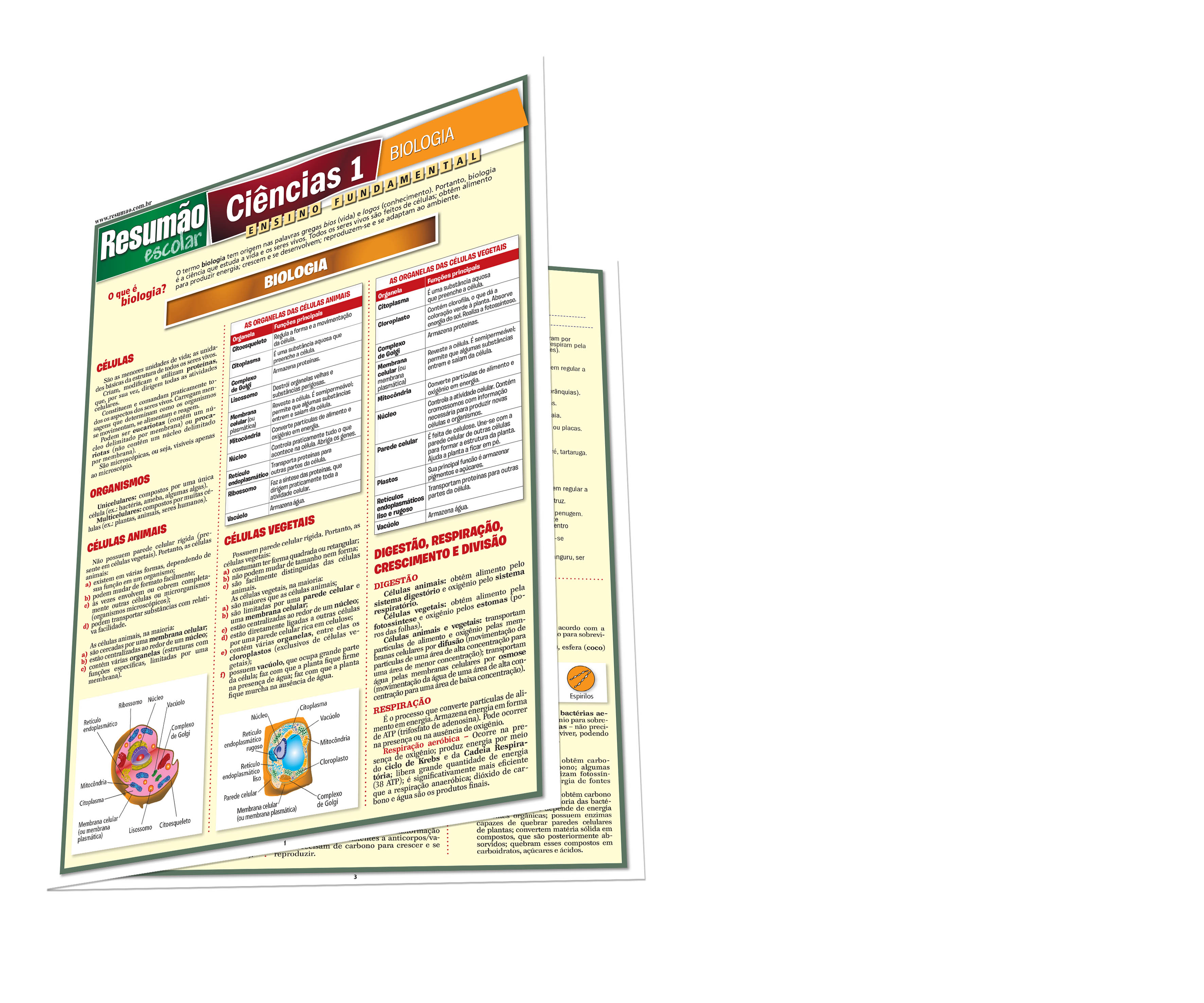 Este Resumão aborda os conceitos básicos da biologia: o que são células, células animais e células vegetais; como se dá a digestão, a respiração, o crescimento e a divisão das células; DNA, genes e cromossomos, além do sistema de classificação dos seres vivos. E ainda: reino vegetal (partes da planta, fotossíntese e reprodução das flores); reino animal (invertebrados e vertebrados) e reinos protista, fungi e monera. Na última página, os princípios fundamentais da ecologia (organização ecológica, relações, cadeia e teia alimentar e ciclos do oxigênio e da água).