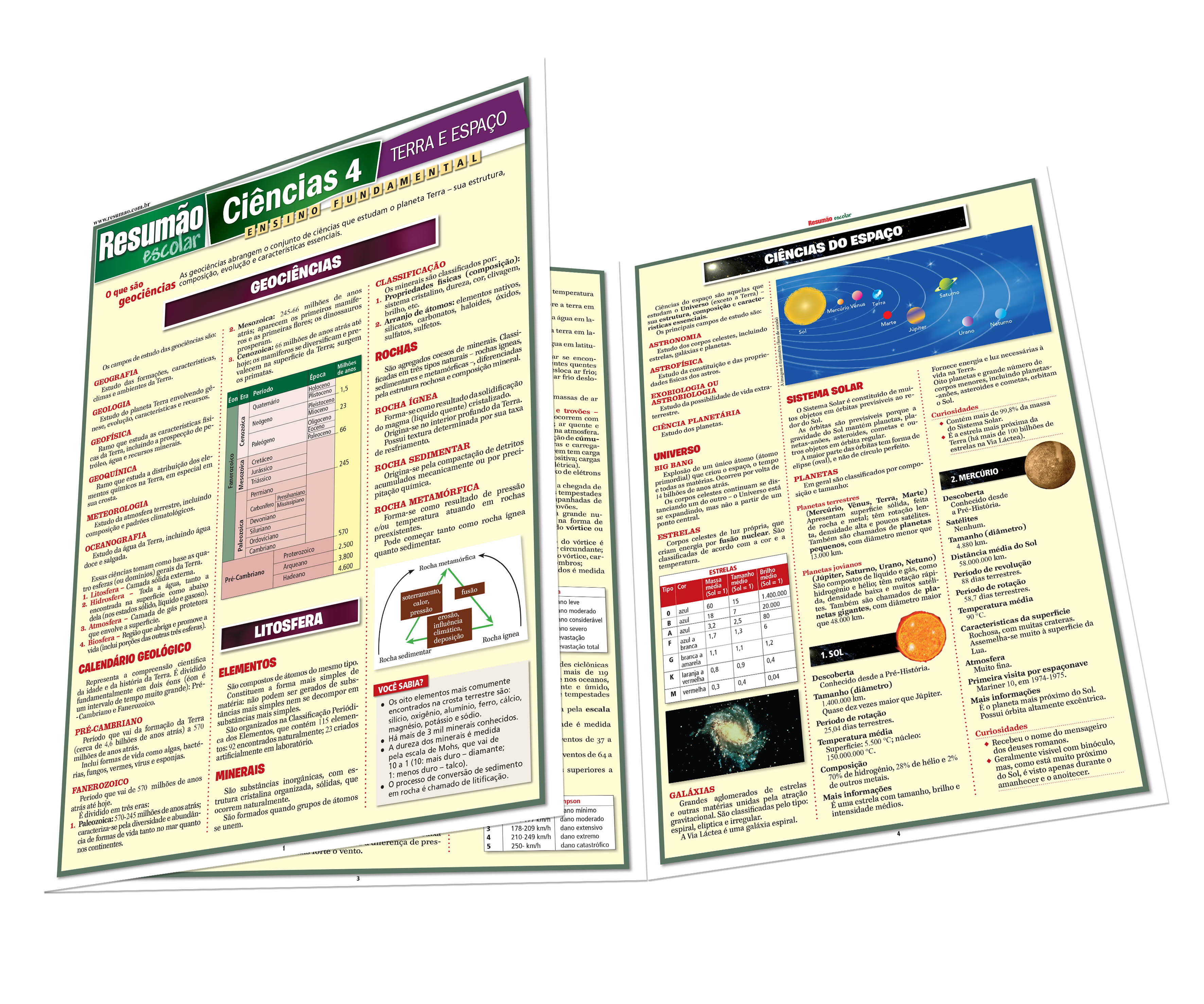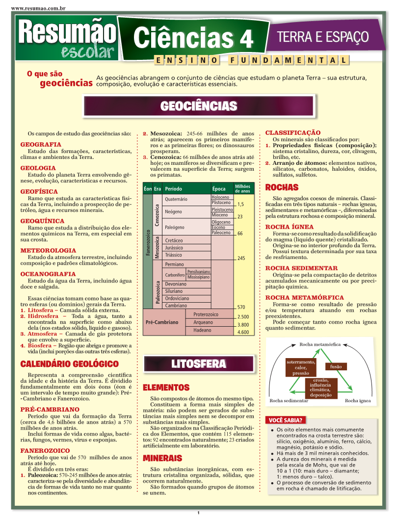 Neste Resumão você encontra os conceitos básicos das geociências e também: litosfera (minerais, rochas, camadas da terra, placas tectônicas e processos geológicos), hidrosfera (águas salgada e doce) e atmosfera (formação, organização, efeito estufa, tempo, ventos e tempestades). Na segunda parte, os princípios fundamentais das ciências do espaço e um guia básico do Universo e do Sistema Solar, com informações sobre cada planeta.