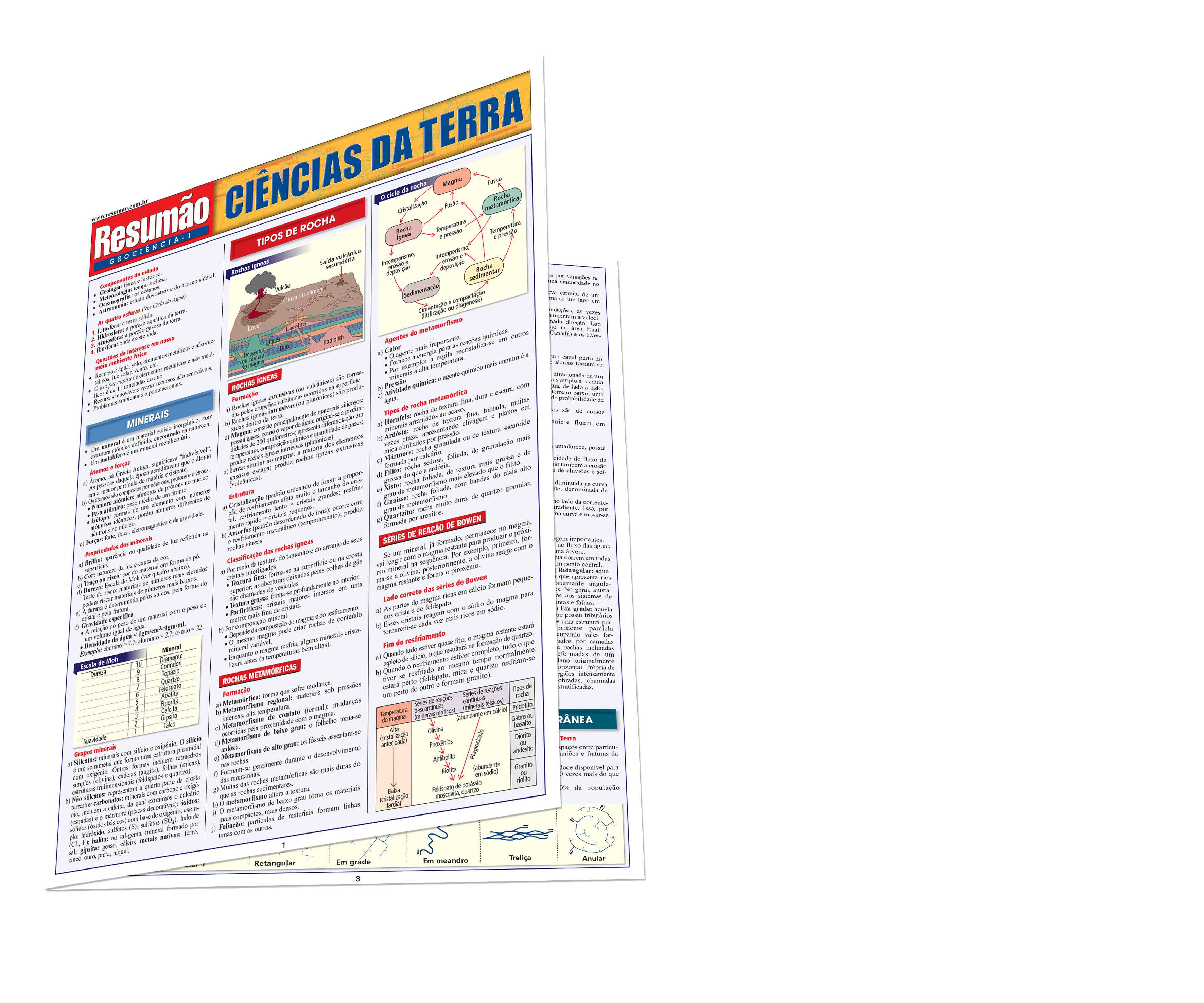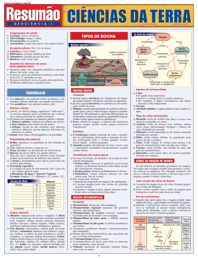 As quatro esferas: litosfera, a terra sólida; hidrosfera, a porção aquática da terra; atmosfera, a porção gasosa da terra; e a biosfera, onde existe vida. Minerais: propriedades dos minerais, grupos minerais. Tipos de rocha: o ciclo das rochas, rochas ígneas, rochas metamórficas, rochas sedimentares, série de reação de Bowen. Desgaste das massas. O ciclo da água: o caminho que a água percorre, a água que cai sobre a Terra, a dinâmica do ciclo da água. Conformação da Terra. As placas tectônicas. Os vulcões. Os terremotos. | Autor: Eric Hines | Páginas: 4