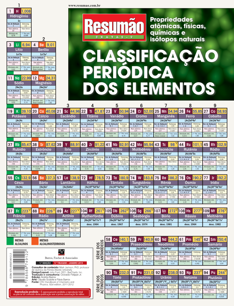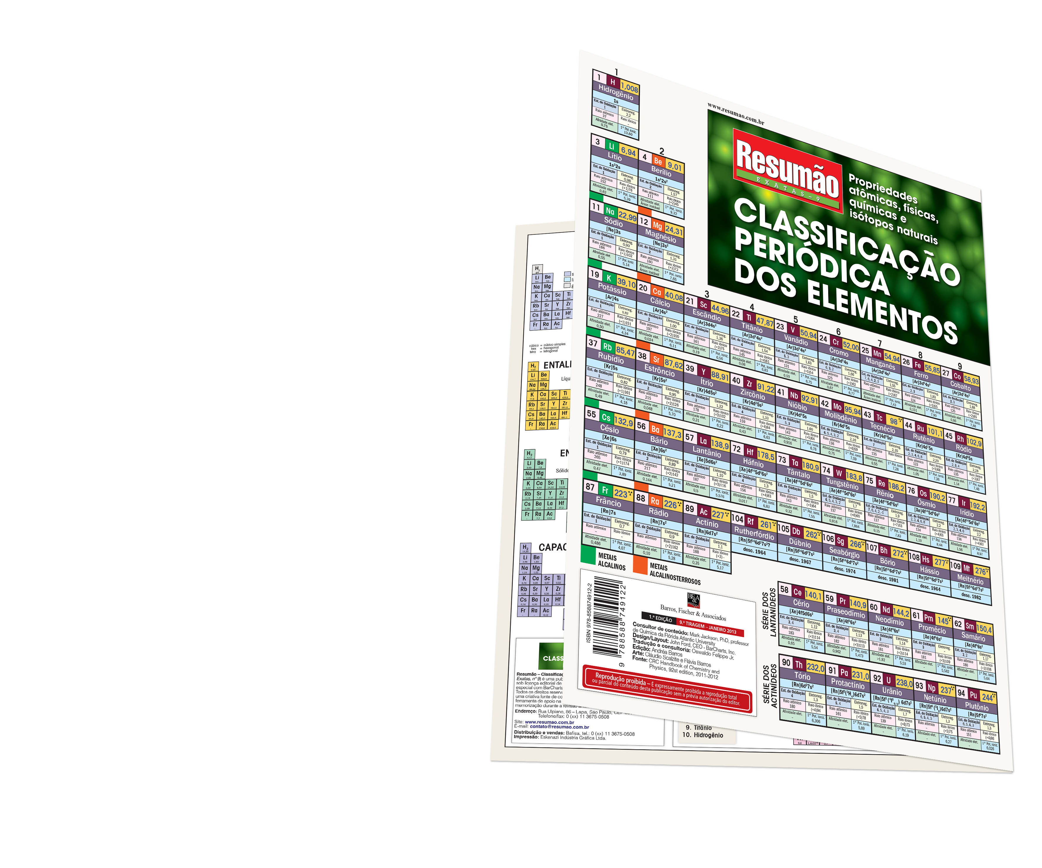 Informações dos elementos indicadas por códigos de cores, o que facilita a consulta. Propriedades atômicas, físicas, químicas e isótopos naturais dos elementos. E mais: número atômico, peso atômico, raio iônico, eletronegatividade, raio atômico, afinidade eletrônica e primeiro potencial de ionização para cada elemento. Tabelas especiais de classificação: por forma natural, densidade, entalpia de vaporização, ponto de ebulição, entalpia de fusão, ponto de fusão, capacidade calorífica específica e por condutividade térmica. Abundância dos elementos na crosta terrestre, propriedades químicas e usos mais comuns dos elementos.