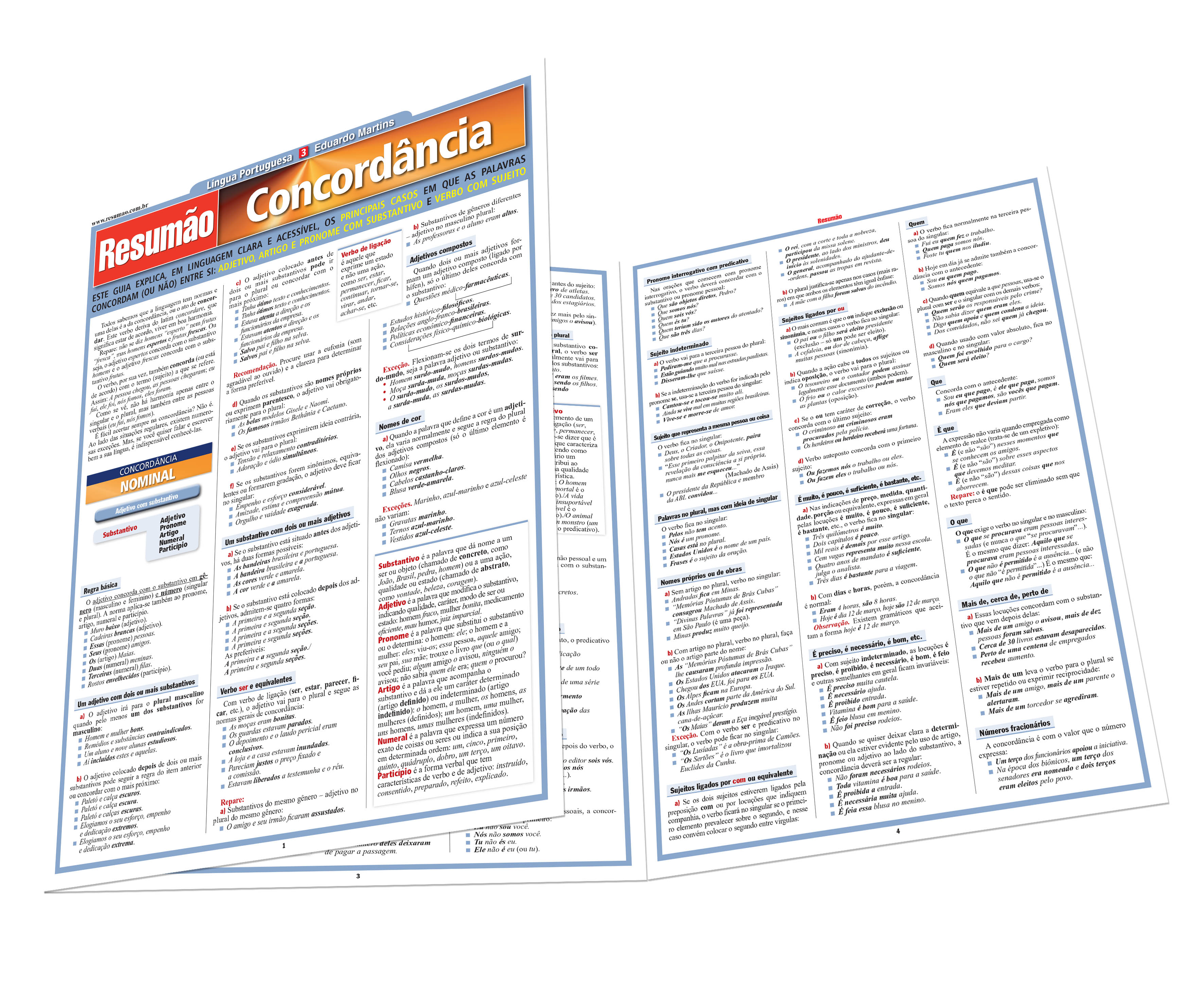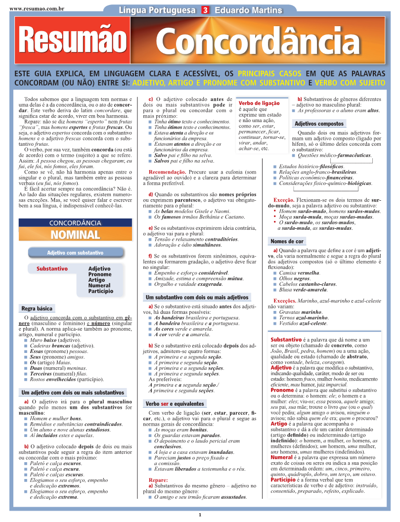 Concordância nominal. Adjetivo com substantivo. Um adjetivo com dois ou mais substantivos. Um substantivo com dois ou mais adjetivos. Verbo ser e equivalentes. Adjetivos compostos. Nomes de cor. Formas de tratamento. Concordância com a ideia. Palavras e locuções variáveis. Concordância verbal. Dois ou mais sujeitos. Pronomes pessoais. Coletivos. Sujeito no singular e predicativo no plural. Pronome pessoal com predicativo. Pronome interrogativo com predicativo. Sujeito indeterminado. Palavras no plural, mas com ideia de singular. Nomes próprios ou de obras. Casos especiais. Erros a evitar. Teste. Atualizado com as novas regras de ortografia.