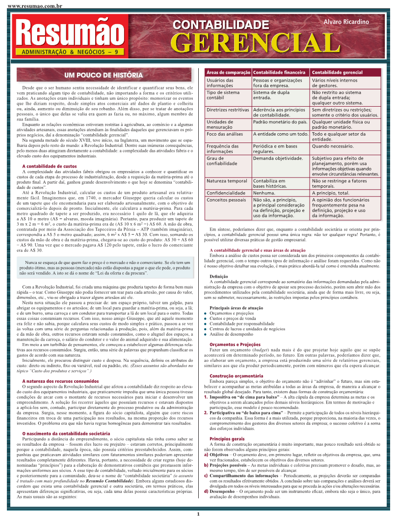 Orçamentos e projeções. Custo dos produtos e serviços: as três áreas da contabilidade de custos. Contabilidade por responsabilidade e margem de contribuição: análise dos custos fixos e variáveis. Formação do preço de venda com base nos custos e com base no mercado. Análise de desempenho. Índices para análise das demonstrações financeiras: os indicadores de capacidade de pagamento; os indicadores de atividade e os indicadores de rentabilidade da empresa.