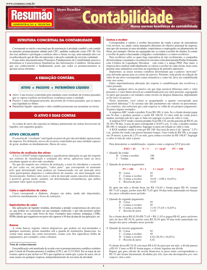Os conceitos básicos de contabilidade de acordo a Lei 11.638/09 e subsequentes. Estrutura Conceitual da Contabilidade. A equação contábil. O ativo e o passivo e suas contas Patrimônio líquido. Balanço patrimonial. Contas de resultado. Demonstrativo do custo das mercadorias vendidas. Demonstrativo de lucros ou prejuízos acumulados. Demonstrativo de Mutações do Patrimônio (DMPL). Demonstração de fluxo de caixa. Novas contas introduzidas pela Lei 11.638/07. Contas que exigem cuidados especiais. Notas explicativas. Relatório da administração. Parecer dos auditores. | Autor: Alvaro Ricardino