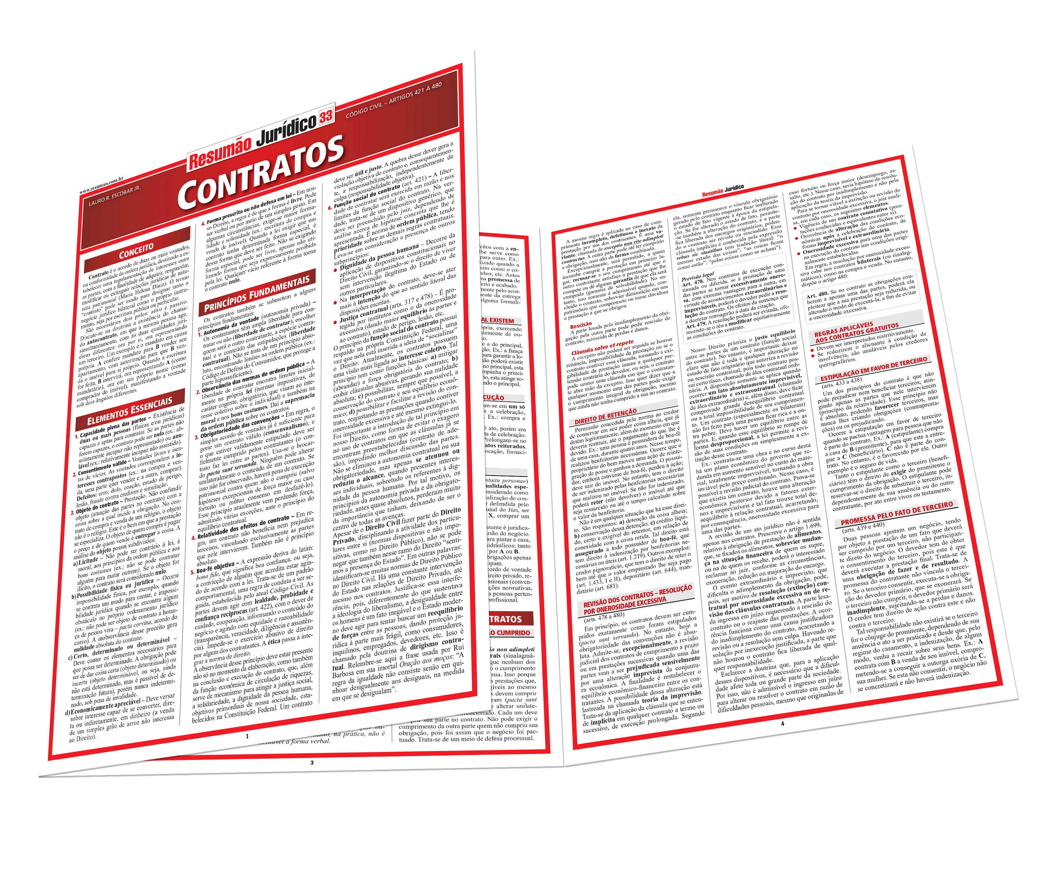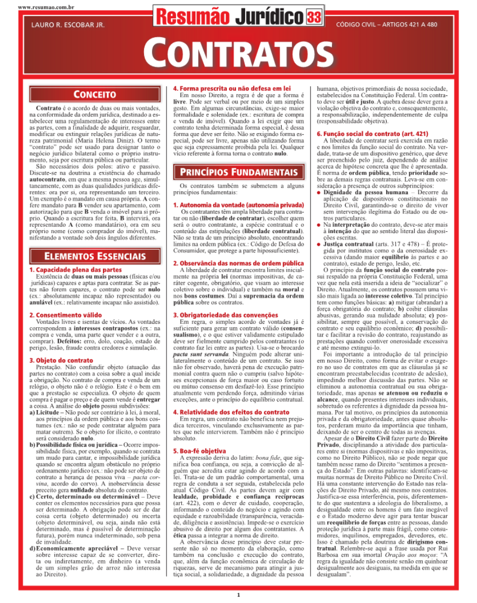 Este título cobre o conteúdo dos artigos 421 a 480 do Código Civil, que trata dos contratos. Conceito de contrato: elementos essenciais, princípios fundamentais, formação do contrato. Espécies de contrato: quanto aos efeitos, quanto à designação, quanto à formação, quanto à forma, quanto ao modo pelo qual existem, quanto à forma de execução, quanto ao agente. Efeitos dos contratos. Extinção da relação contratual. Veja também o Resumão Espécies de contrato. | Autor: Lauro R. Escobar Jr. | Páginas: 6