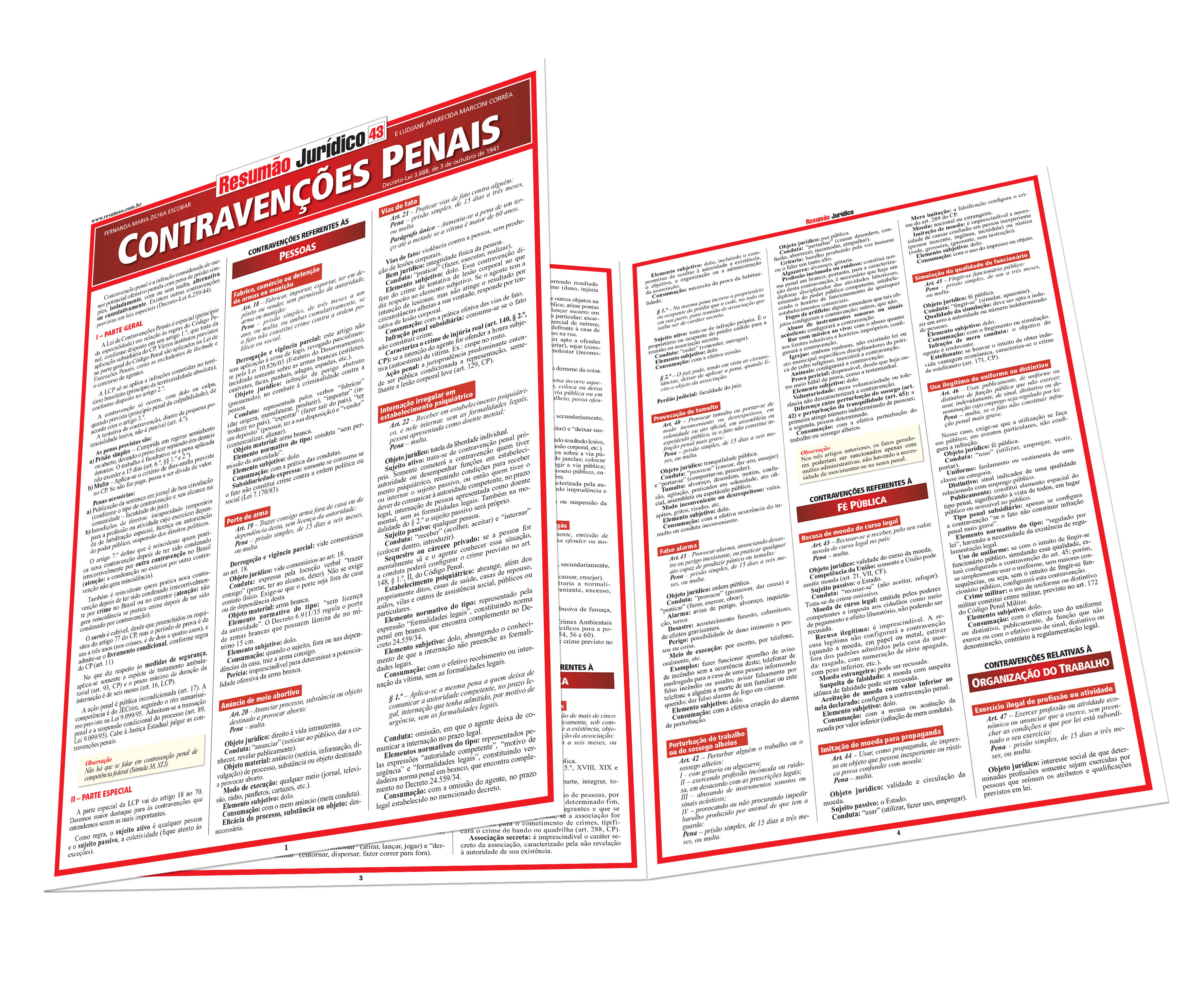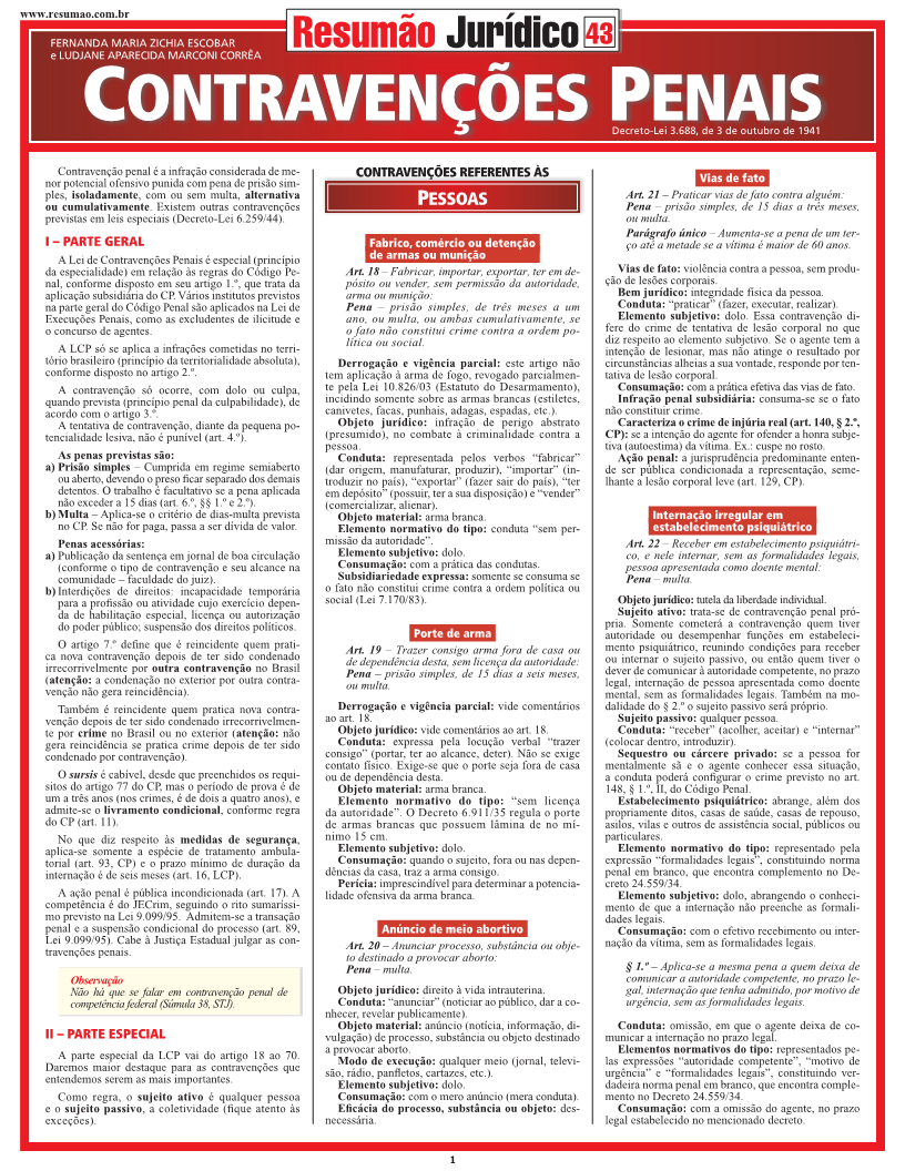 As principais contravenções penais descritas no Decreto-Lei 3.688. Objeto jurídico e objeto material, elementos subjetivos e normativos do tipo, consumação e os pontos mais importantes das contravenções penais.Neste título, destaque para as contravenções mais importantes referentes às pessoas, ao patrimônio, à incolumidade pública, à paz pública, à fé pública, à organização do trabalho, à polícia de costumes e à administração pública. | Autoras: Fernanda Maria Zichia Escobar | Ludjane Aparecida Marconi Corrêa | Páginas: 6