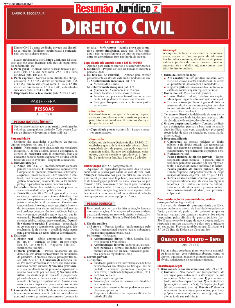Noções e fontes do Direito. Vigência e interpretação das leis. Integração da norma jurídica. Divisão do Código Civil. Pessoas físicas e jurídicas. Desconsideração da pessoa jurídica. Objeto do Direito ? Bens. Fatos jurídicos. Elementos do negócio jurídico. Defeitos e ineficácia do negócio jurídico. Ato ilícito e responsabilidade penal. Obrigações ? Parte geral: elementos constitutivos; fontes; classificação e efeitos das obrigações; cláusula penal; mora; extinção, cessão e transmissão das obrigações. Contratos. Direito das coisas. Direitos reais sobre coisas alheias. Espécies. | Autor: Lauro R. Escobar Jr. | Páginas: 6