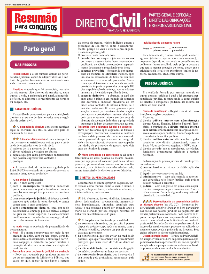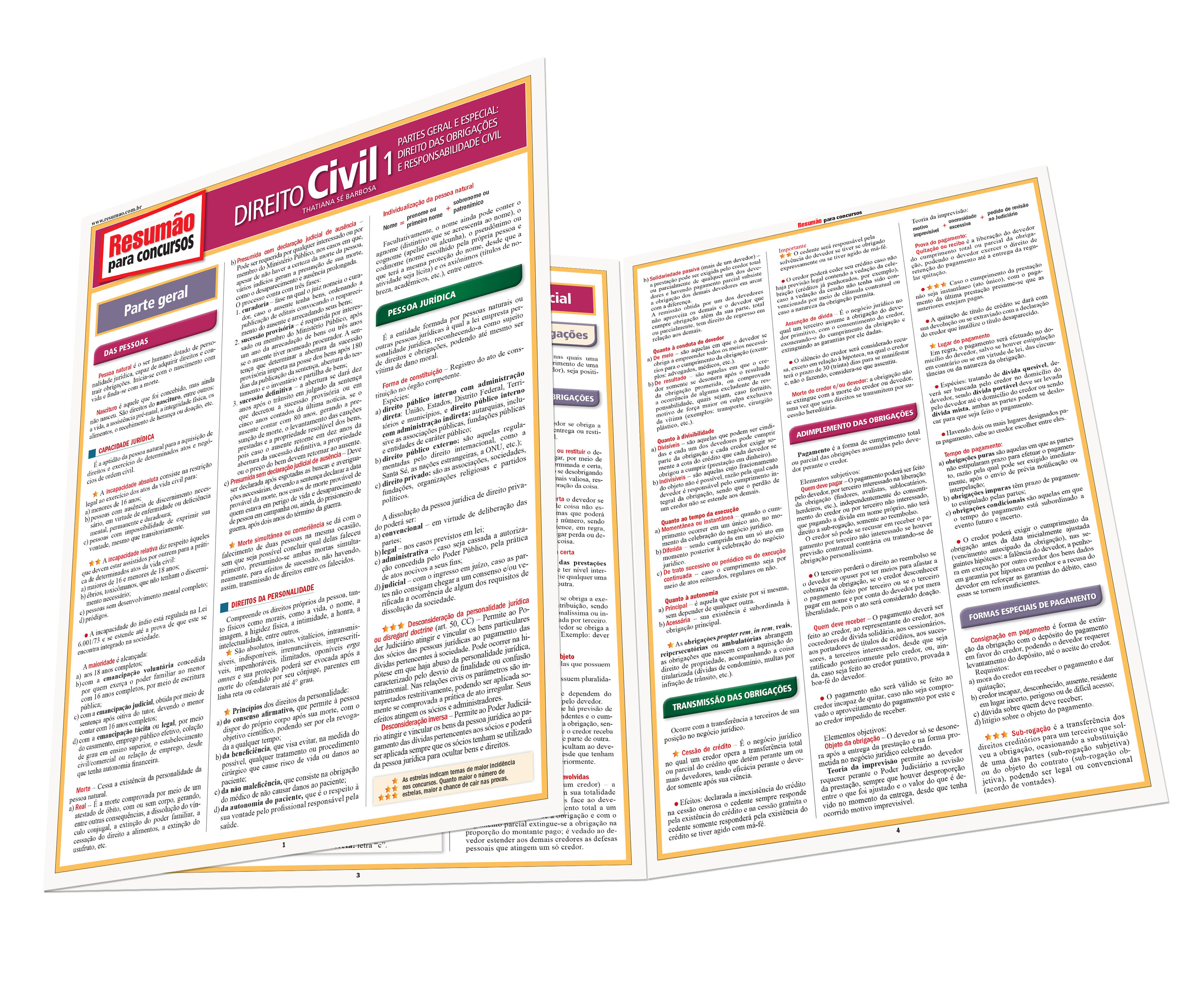 Este Resumão aborda os principais conceitos do Direito Civil (partes geral e especial, do direito das obrigações à responsabilidade civil) com foco nos concursos públicos. Confira os temas elencados: parte geral das pessoas, pessoa jurídica, bens e coisas, fatos jurídicos, negócio jurídico, prescrição e decadência; parte especial direito das obrigações (classificação, transmissão, adimplemento, formas especiais de pagamento e inadimplemento) e responsabilidade civil (espécies, indenização e excludentes de responsabilidade).