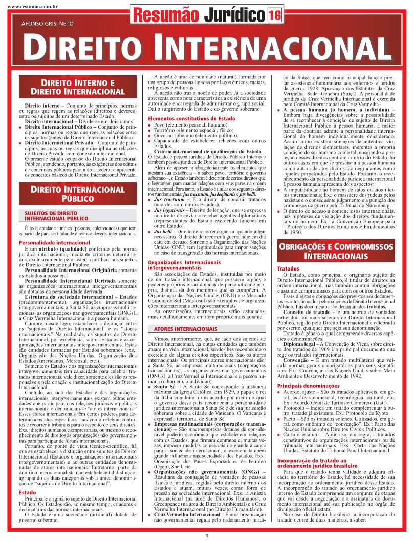 Direito interno e direito internacional. Direito Internacional Público. Estado. Obrigações e compromissos internacionais. Direito Internacional Ambiental. Proteção universal dos direitos humanos. Direitos de integração e direito comunitário. Faixas de comércio internacional. Mercosul. Conflitos internacionais: solução pacífica e solução coercitiva. Direito Penal Internacional. Serviços diplomático e consular. Nacionalidade. Regime jurídico do estrangeiro. Direito internacional da navegação marítima e de navegação aérea. Noções fundamentais de Direito Internacional Privado. | Autor: Afonso Grisi Neto
