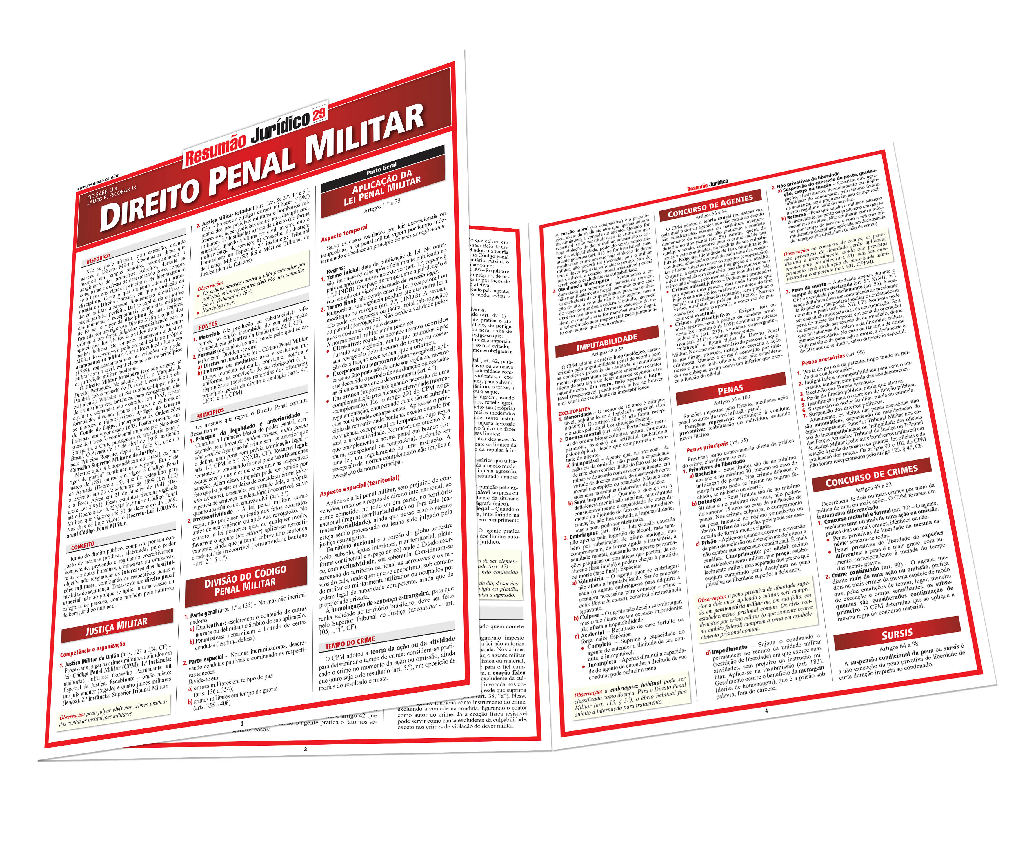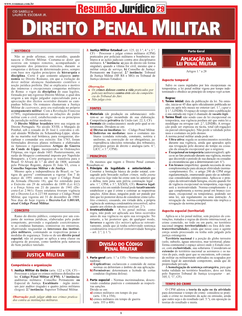 Histórico e conceito do Direito Penal Militar. Justiça Militar. Divisão do Código Penal Militar. Parte geral ? Aplicação da Lei Penal Militar, crime militar, imputabilidade, concurso de agentes, penas, concurso de crimes, {sursis}, livramento condicional, medidas de segurança, extinção de punibilidade. Parte especial ? Crime militar em tempo de paz, crimes contra a autoridade ou disciplina militar, crimes contra o serviço militar e o dever militar, outros crimes. | Autores: Cid Sabelli | Lauro R. Escobar Jr. | Páginas: 6