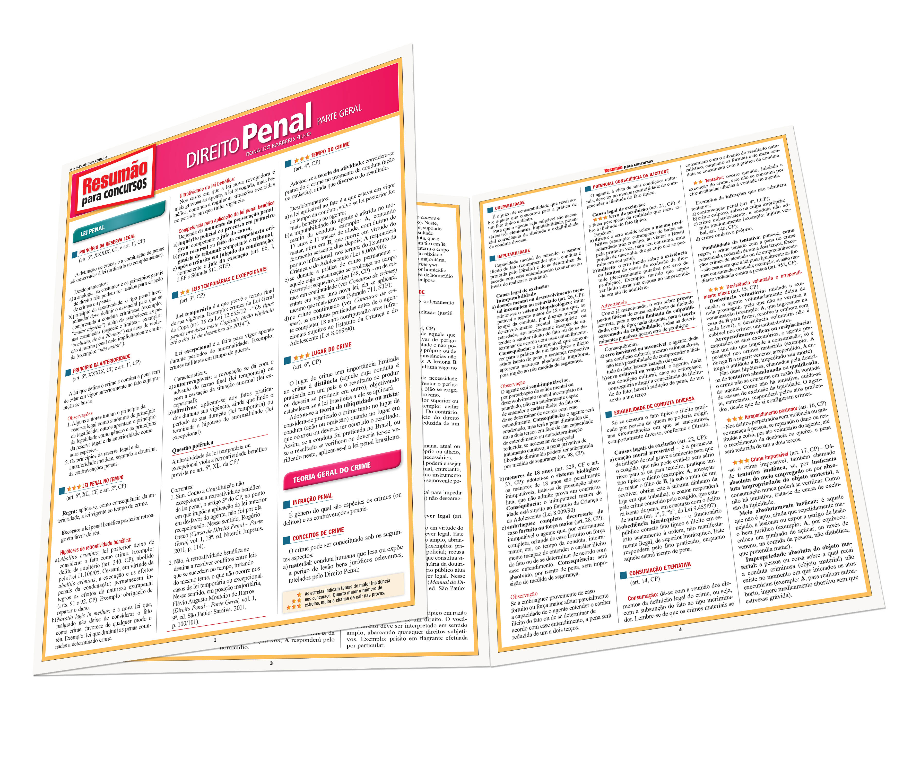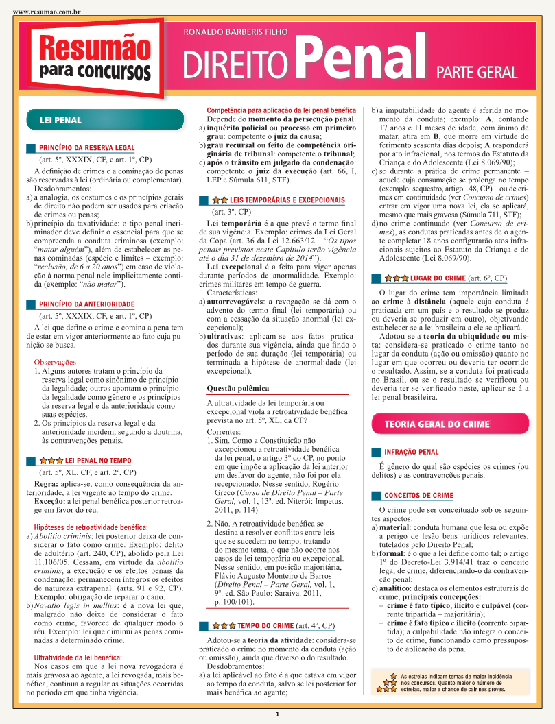 Este título trata dos principais conceitos do Direito Penal – Parte geral, com foco nos concursos públicos. Lei penal (princípios da reserva legal e da anterioridade, lei penal no tempo, leis temporárias e excepcionais, tempo e lugar do crime) teoria geral do crime (infração penal, conceitos de crime, fato típico, conduta, resultado, relação de causalidade e nexo causal, tipicidade, erro de tipo, ilicitude ou antijuricidade, culpabilidade, imputabilidade, potencial consciência da ilicitude, exigibilidade de conduta diversa, consumação e tentativa, concurso de pessoas), concurso de crimes (concurso material ou real, concurso formal ou ideal, crime continuado) e prescrição são os temas elencados.