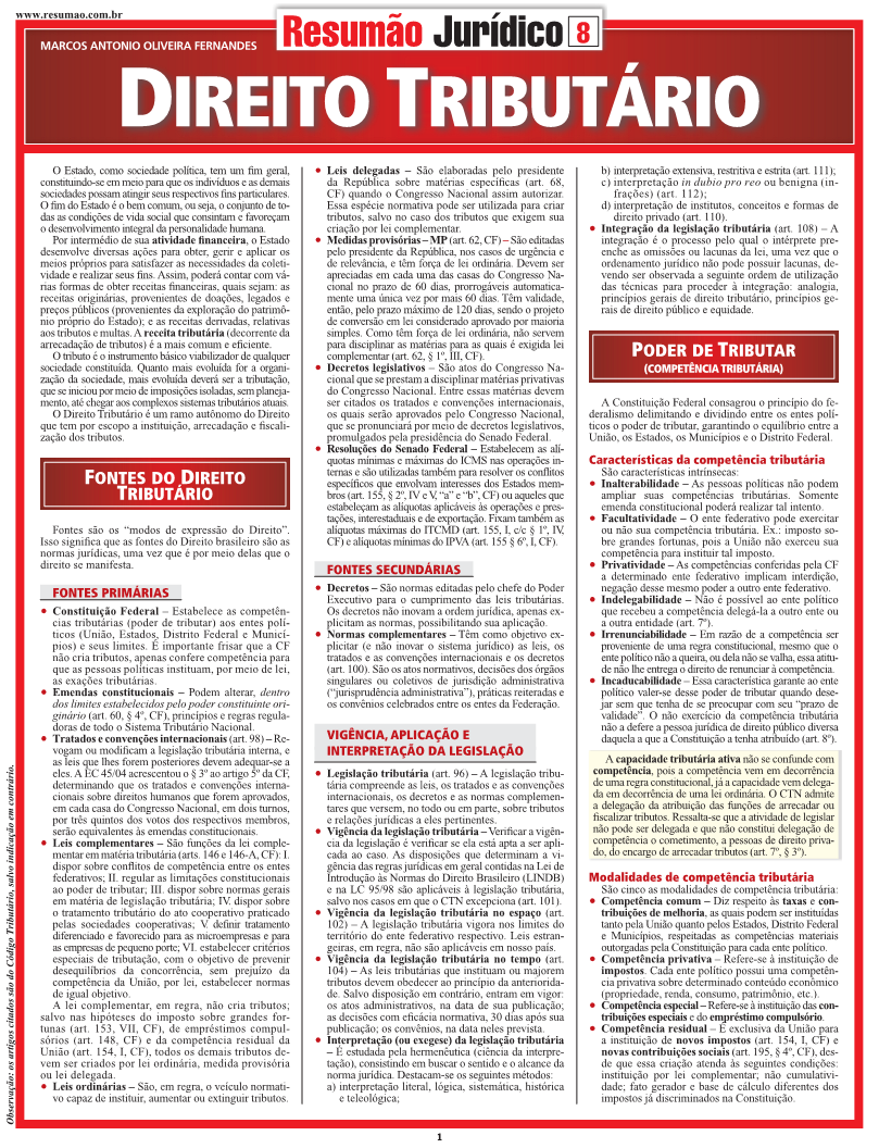 Este Resumão apresenta os principais temas do Direito Tributário brasileiro e é um excelente guia de estudos para entender definições, relembrar conceitos e preparar para provas. Entre os itens abordados estão: conceito de tributo, espécies tributárias e os impostos federais, estaduais e municipais, competência tributária e as limitações ao poder de tributar, responsabilidade tributária, crédito tributário e as normas gerais do Direito Tributário. | Autor: Alessandro Spilborghs | Páginas: 6