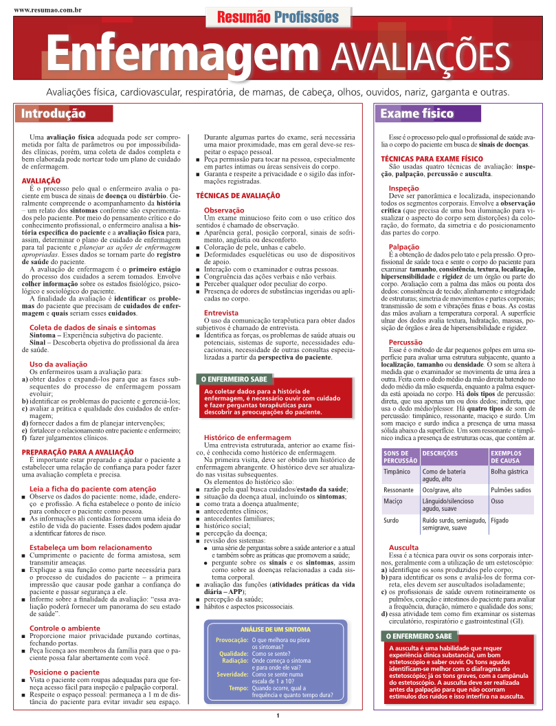 Os principais conceitos da avaliação de um paciente pelos enfermeiros. Técnicas de avaliação e exame físico (inspeção, palpação, percussão e ausculta) dos principais sistemas do corpo humano. Sistema cardiovascular, cabeça e pescoço, avaliação da pele, sistema respiratório, gastrointestinal, urogenital, musculoesquelético, neurológico e mamas. E ainda: a pós-avaliação, com documentação e síntese crítica. | Autora: Deborah Raines, Ph.D.
