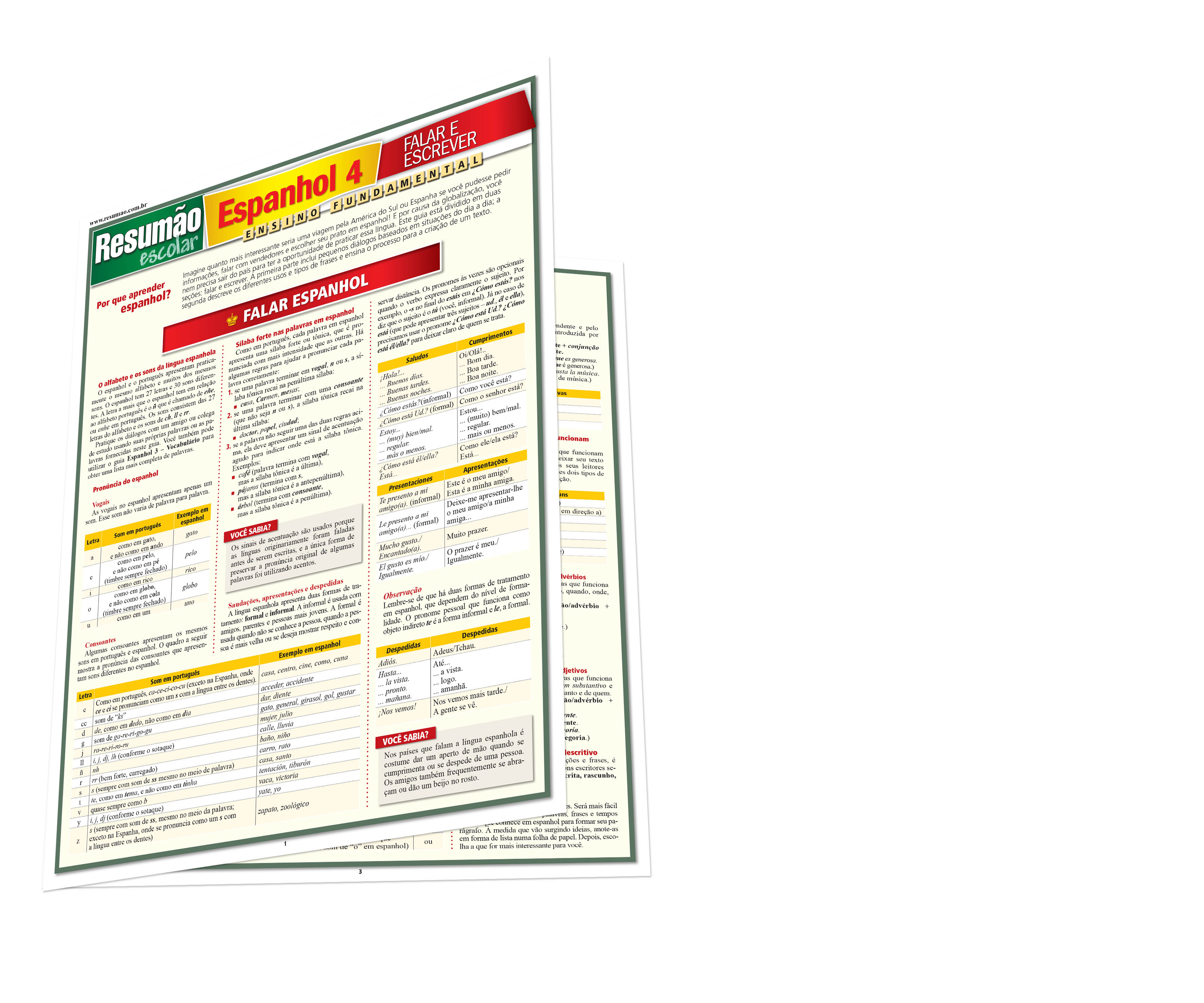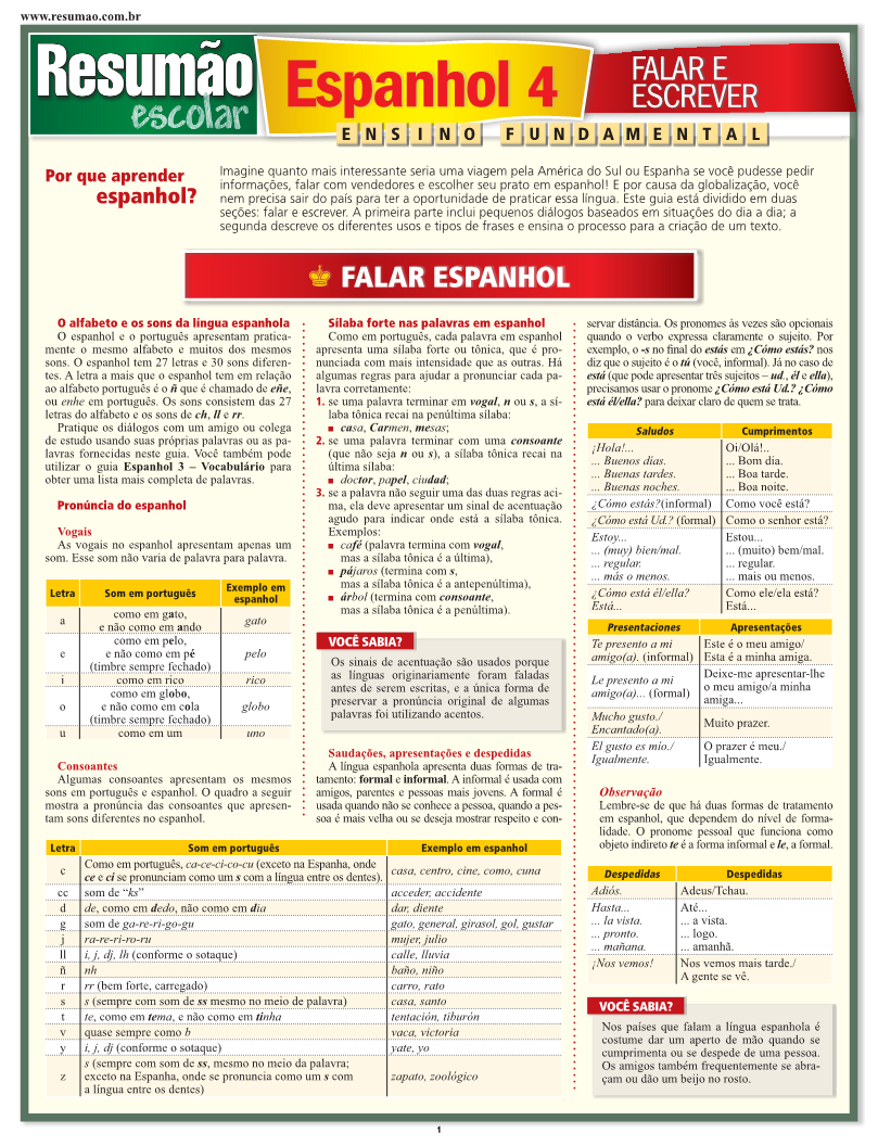 Este Resumão traz dicas para falar melhor a língua espanhola: a pronúncia, as consoantes, as sílabas fortes e alguns diálogos básicos para situações comuns no dia a dia. Na segunda parte do guia, informações para escrever corretamente: tipos de orações, a estrutura das orações e um exemplo explicado de uma pequena redação em espanhol. | Páginas: 4