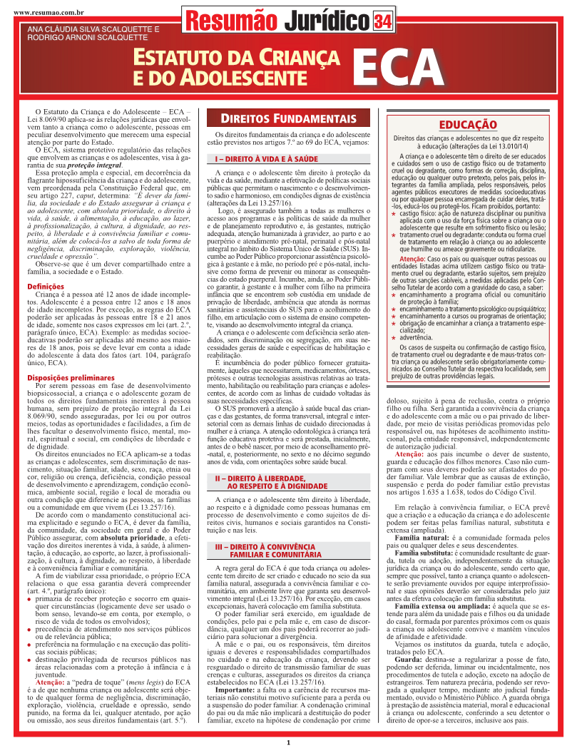 Definições e disposições preliminares do Estatuto da Criança e do Adolescente. Os direitos fundamentais da criança e do adolescente: direito à vida e à saúde; direito à liberdade, ao respeito e à dignidade; direito à convivência familiar e comunitária; direito à educação, à cultura, ao esporte e ao lazer; direito à profissionalização e proteção no trabalho. Sistema de prevenção especial. Política de atendimento. Prática de ato infracional. Remissão. Sistema de proteção integral. Acesso à Justiça. Crimes contra a criança e adolescente. E ainda: as principais regras relativas à adoção (Lei 12.010/09). | Autores: Ana Cláudia S. Scalquette | Rodrigo Arnoni Scalquette | Páginas: 6