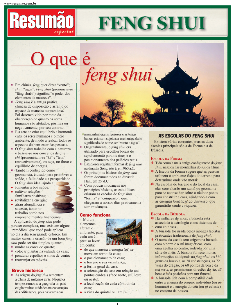 O que é feng shui, breve histórico, como funciona e as escolas do feng shui (Escola da Forma e Escola da Bússola). O significado de Qi. As formas de Qi: Qi celeste (Qi planetário e Qi do tempo); Qi terrestre (Qi natural e Qi criado pelo homem); Qi humano (Qi social e Qi pessoal). Os princípios básicos do feng shui: yin e yang, os oito trigramas e os presságios, os cinco elementos e seus ciclos, o pa-kua e os oito remédios. Feng shui em casa e no trabalho. | Autor: Dale Nibbe
