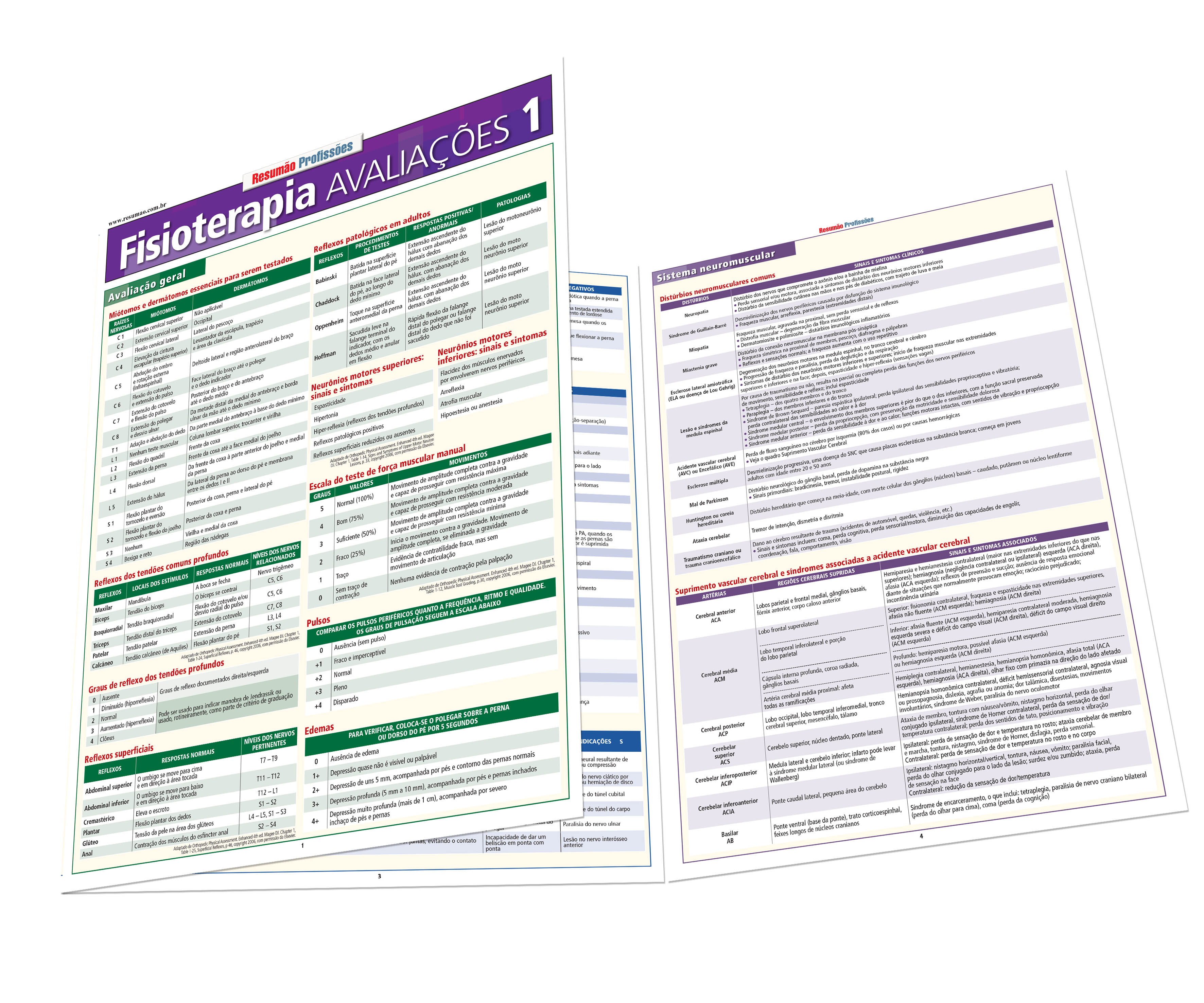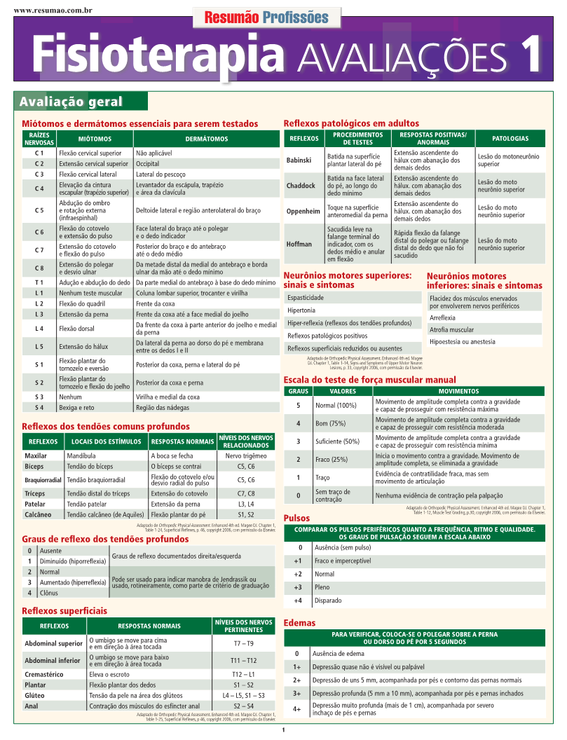 As informações são organizadas em tabelas de consulta rápida e eficiente. Na avaliação geral, por exemplo, informações sobre miótomos e dermátomos essenciais, reflexos superficiais, reflexos patológicos, escala do teste de força muscular manual, pulsos e edemas entre outros. E ainda: avaliações dos sistemas musculoesquelético e neuromuscular. O Resumão Fisioterapia Avaliações 2 traz as informações que completam o Avaliações 1, com os sistemas pulmonar e cardiovascular, além do tegumentar. | Autores: Mary Blackinton Morey, J. Kolber e Bini Litwin