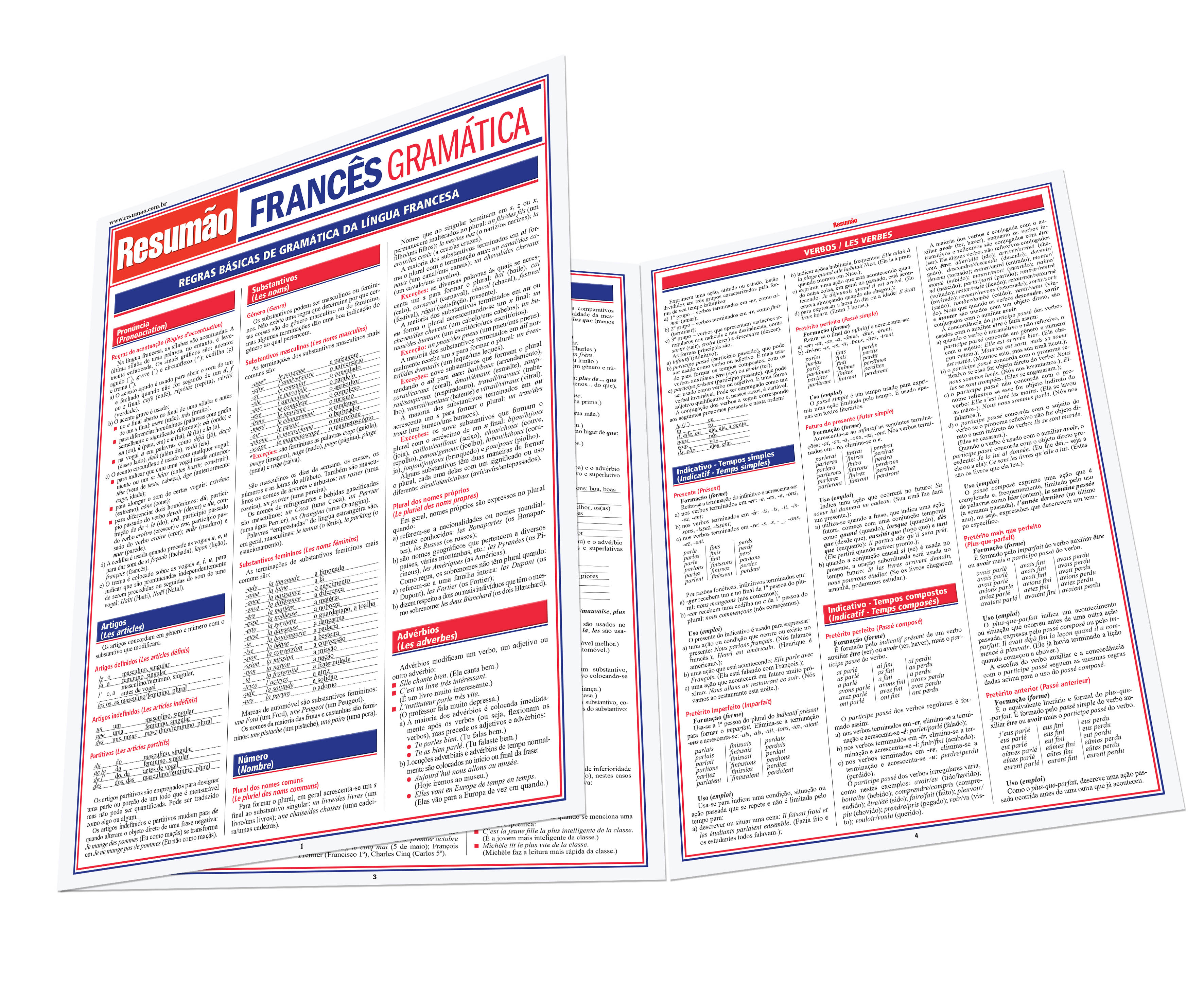 Este guia apresenta as regras básicas da gramática da língua francesa. Pronúncia, regras de acentuação, artigos, substantivos e gêneros, plural, advérbios, pronomes pessoais e colocação dos pronomes nas frases, adjetivos e comparativos. Verbos: tempos verbais, simples e compostos, forma e uso, modos. Condicional. Concordância de tempos verbais nas orações, verbos irregulares e expressões idiomáticas. | Autora: Liliane Arnet | Páginas: 6
