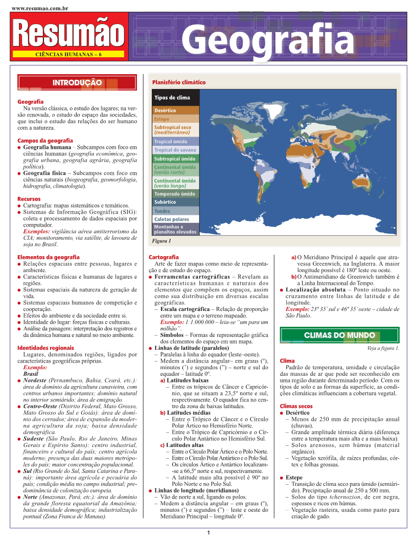 Geografia aborda os climas do mundo, a população, a geografia política, a cultura e a economia. Geografia humana, geografia física, recursos, elementos, identidades regionais, cartografia. Planisfério climático. Climas do mundo. Ventos. O meio geográfico: energia, água, processos de formação do relevo. Placas tectônicas. População: demografia, conceitos, povoamento, transformação da paisagem, desenvolvimento das sociedades, modelo de transição demográfica, população mundial, fatos demográficos mundiais. Geografia política. Cultura. Economia.