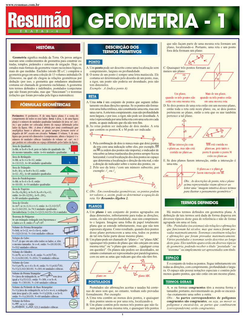 História e descrição dos termos primitivos: ponto, reta, planos e postulados. Termos definidos: espaço, termos gerais, retas, planos, segmentos de reta, semirretas e ângulos. E mais: um quadro com fórmulas geométricas para o cálculo da área e do volume de diversas figuras geométricas. Geometria 1 com Geometria 2 contêm os conceitos básicos da matéria e são de inestimável ajuda para estudantes que têm dificuldades para entender e aplicar os conceitos de geometria.
