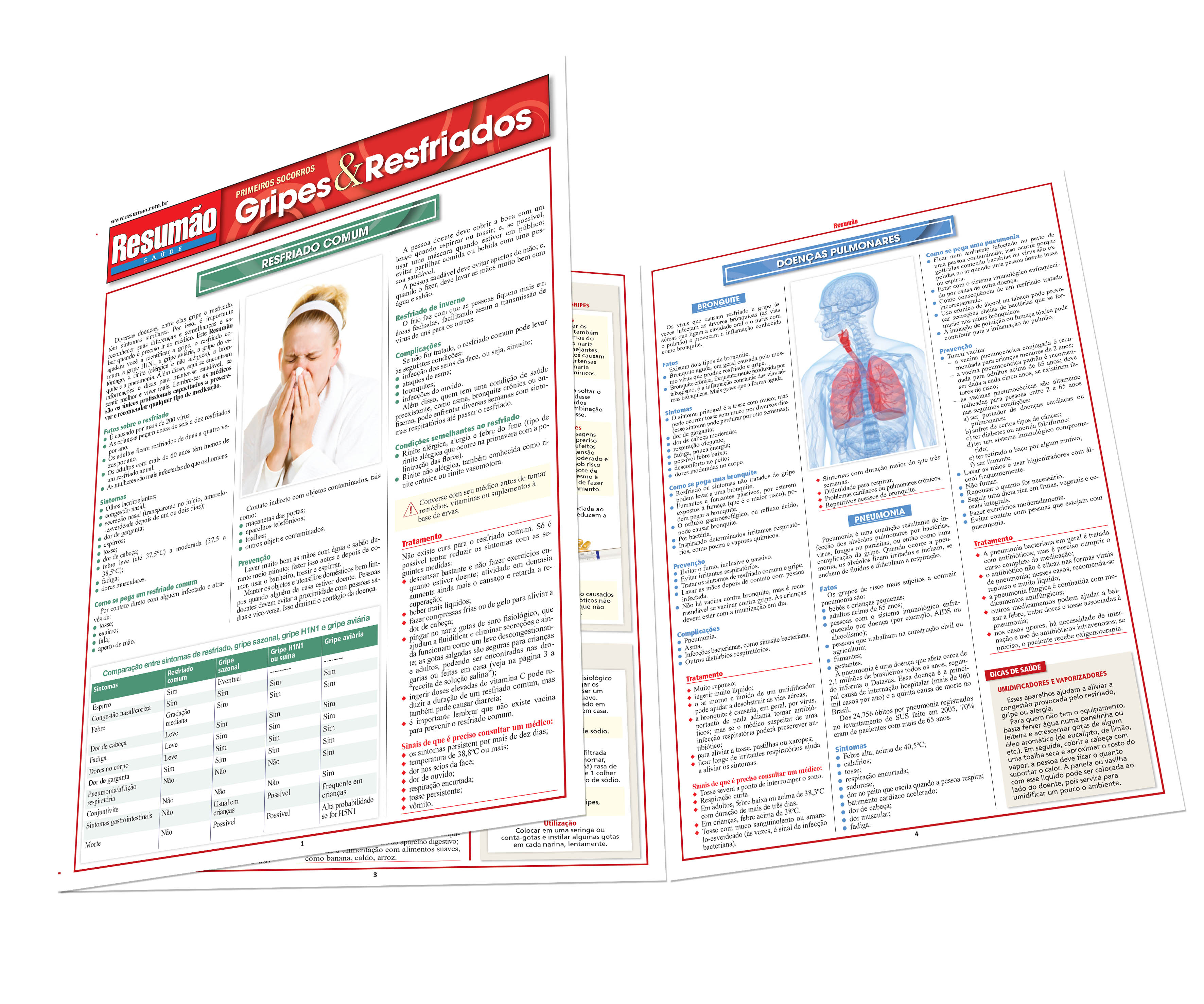 Gripes e resfriados são doenças muito comuns que atingem crianças e adultos todos os anos. Eles também têm sintomas bastante semelhantes. Este Resumão ajuda o leitor a identificar a reconhecer o resfriado comum, os vários tipos de gripe, as doenças pulmonares e as rinites. Sintomas, prevenção, complicações, tratamentos e, ainda, dicas para uma vida saudável. | Páginas: 6
