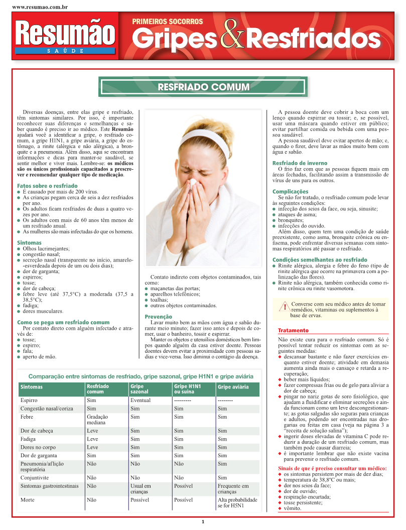 Gripes e resfriados são doenças muito comuns que atingem crianças e adultos todos os anos. Eles também têm sintomas bastante semelhantes. Este Resumão ajuda o leitor a identificar a reconhecer o resfriado comum, os vários tipos de gripe, as doenças pulmonares e as rinites. Sintomas, prevenção, complicações, tratamentos e, ainda, dicas para uma vida saudável.