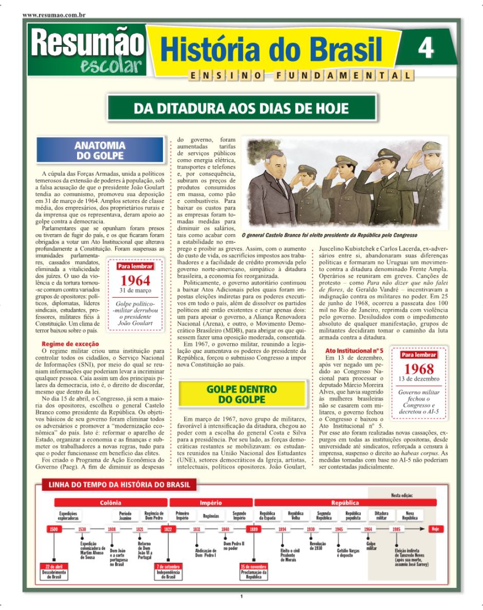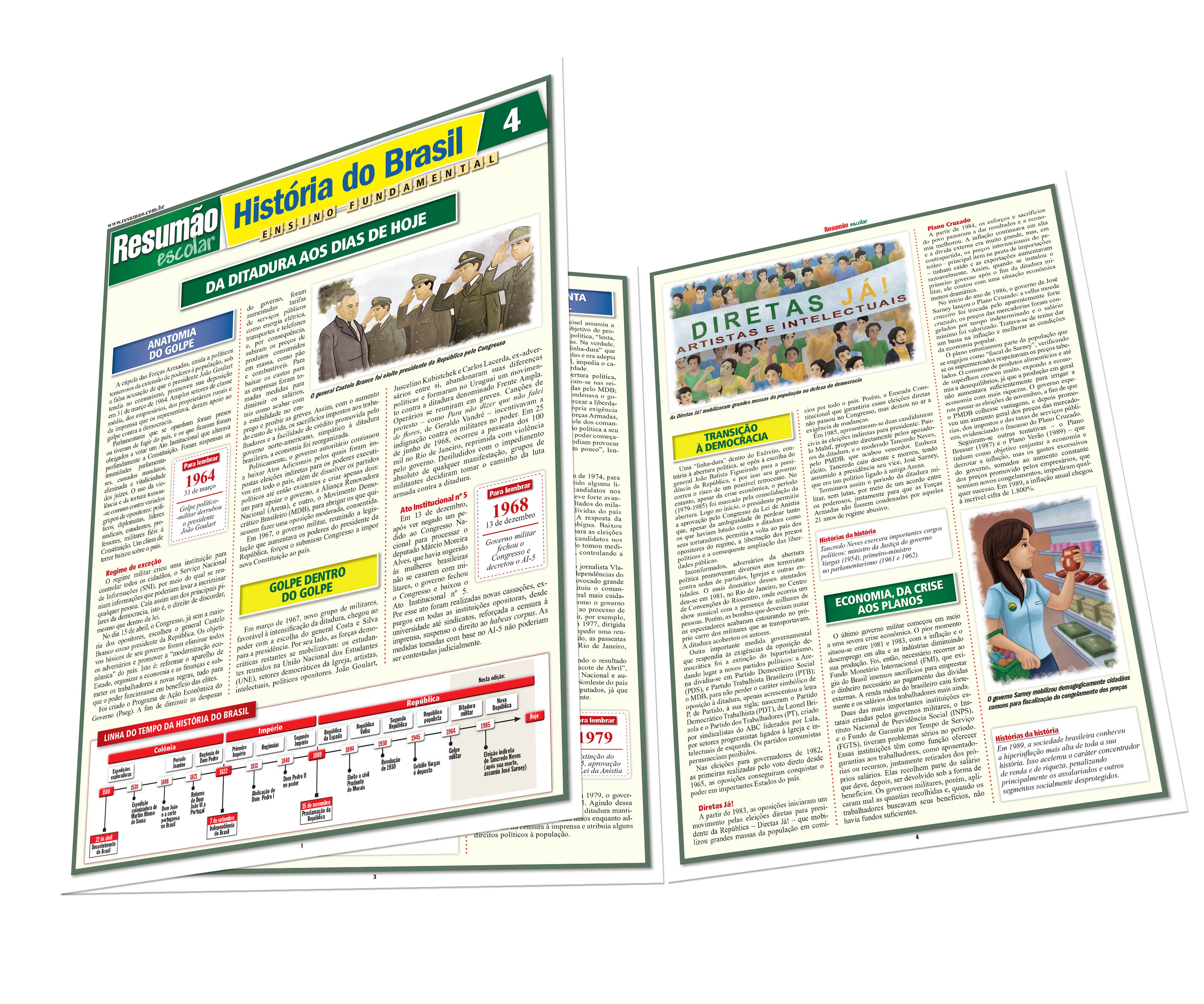 Os principais acontecimentos da história republicana brasileira foram divididos em dois Resumões. História do Brasil 4 aborda o segundo período, desde a ditadura militar até os dias de hoje. A anatomia do golpe e o regime de exceção; o golpe dentro do golpe, o Ato Institucional no. 5; o populismo autoritário; a luta armada e a repressão; o milagre brasileiro; a cultura contra a ditadura; a abertura lenta e gradual; a transição à democracia; a economia, da crise aos planos; a Constituição Cidadã; os caras pintas; o plano Real; Lula chega ao poder; o Brasil no mundo e a sexta economia. | Autor: Alexandre Hecker | Páginas: 6