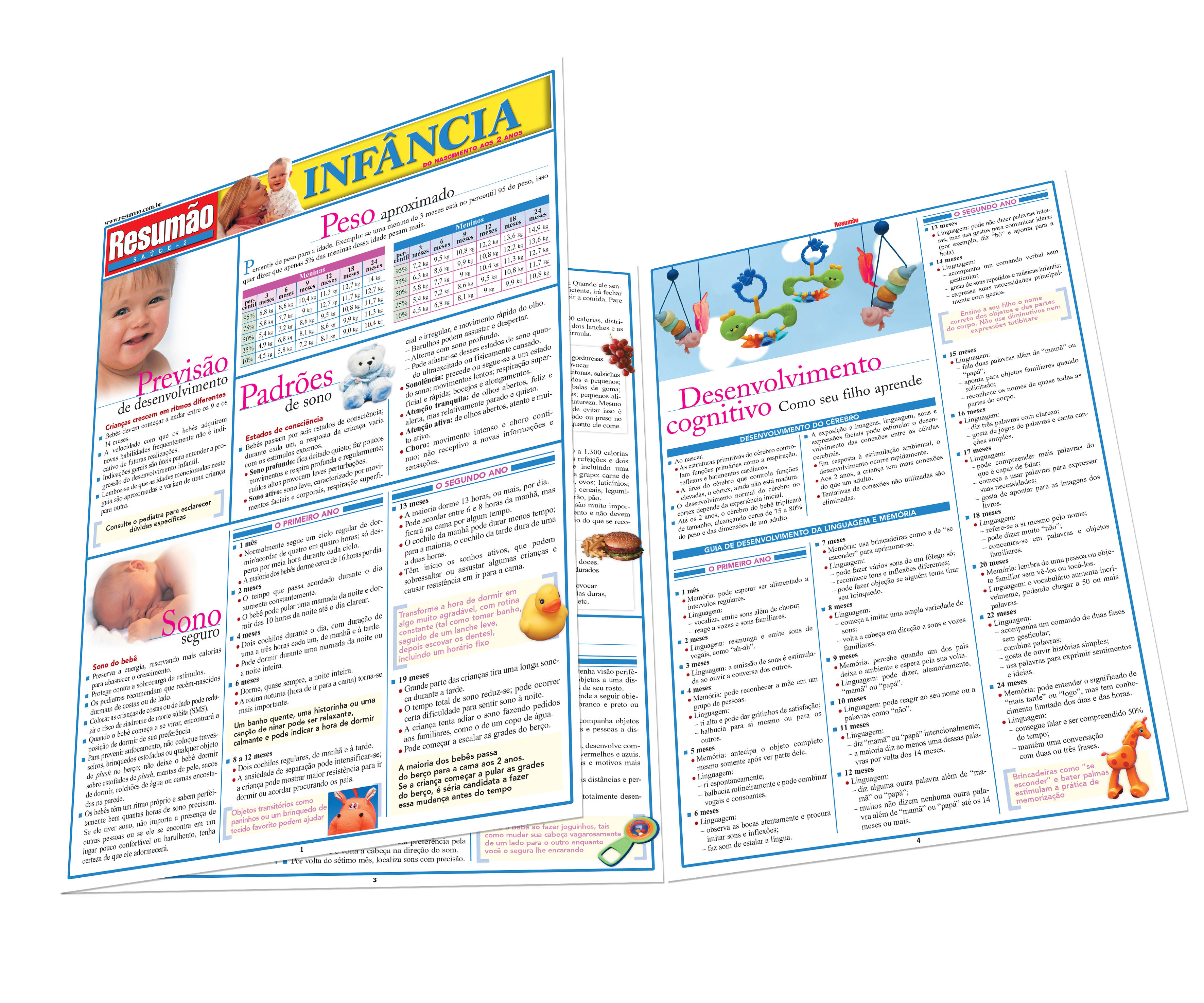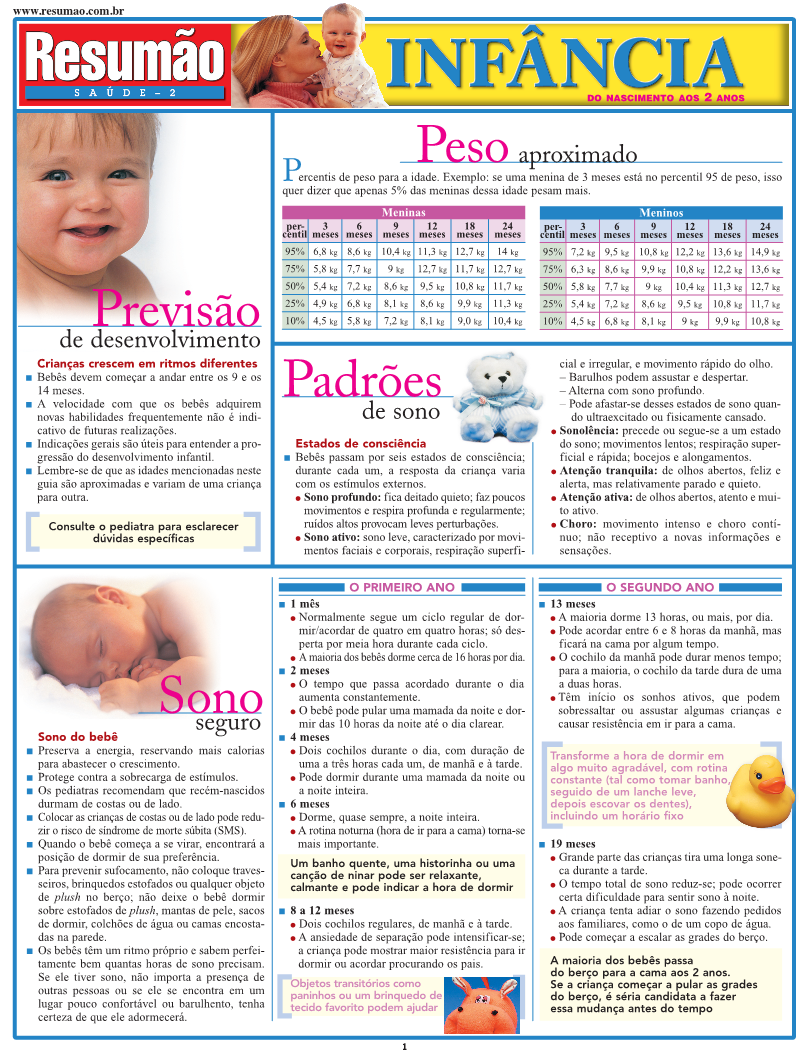 Orientação para acompanhar o desenvolvimento das crianças do nascimento aos 2 anos: previsão de desenvolvimento, peso aproximado, padrões de sono. Desenvolvimento motor. Hábitos alimentares saudáveis. Desenvolvimento perceptivo: olfato, tato e paladar, audição e visão. Desenvolvimento cognitivo: como seu filho aprende. Calendário básico de vacinação da criança. Cuidados com a segurança. Porcentagem de realizações por idade.