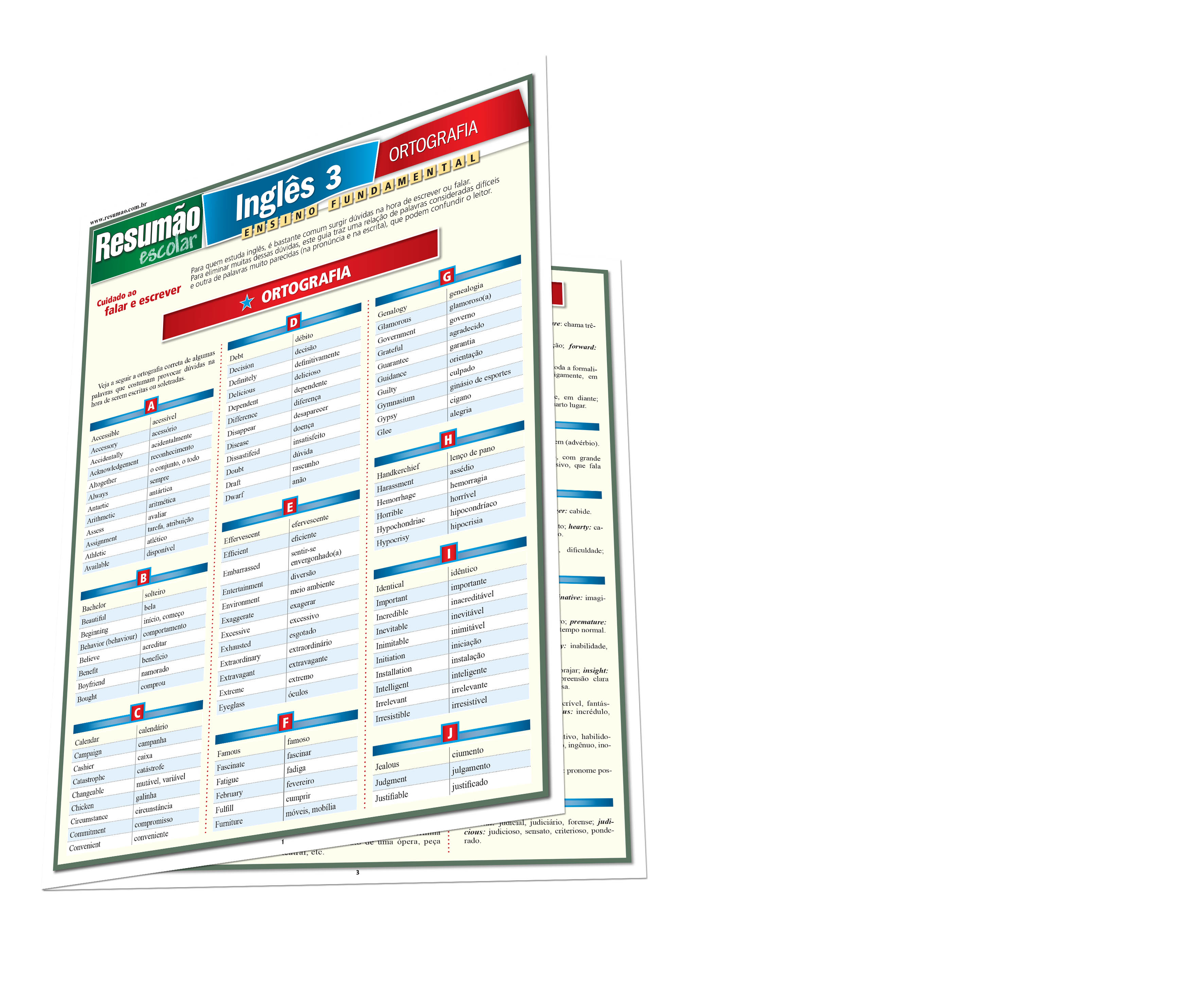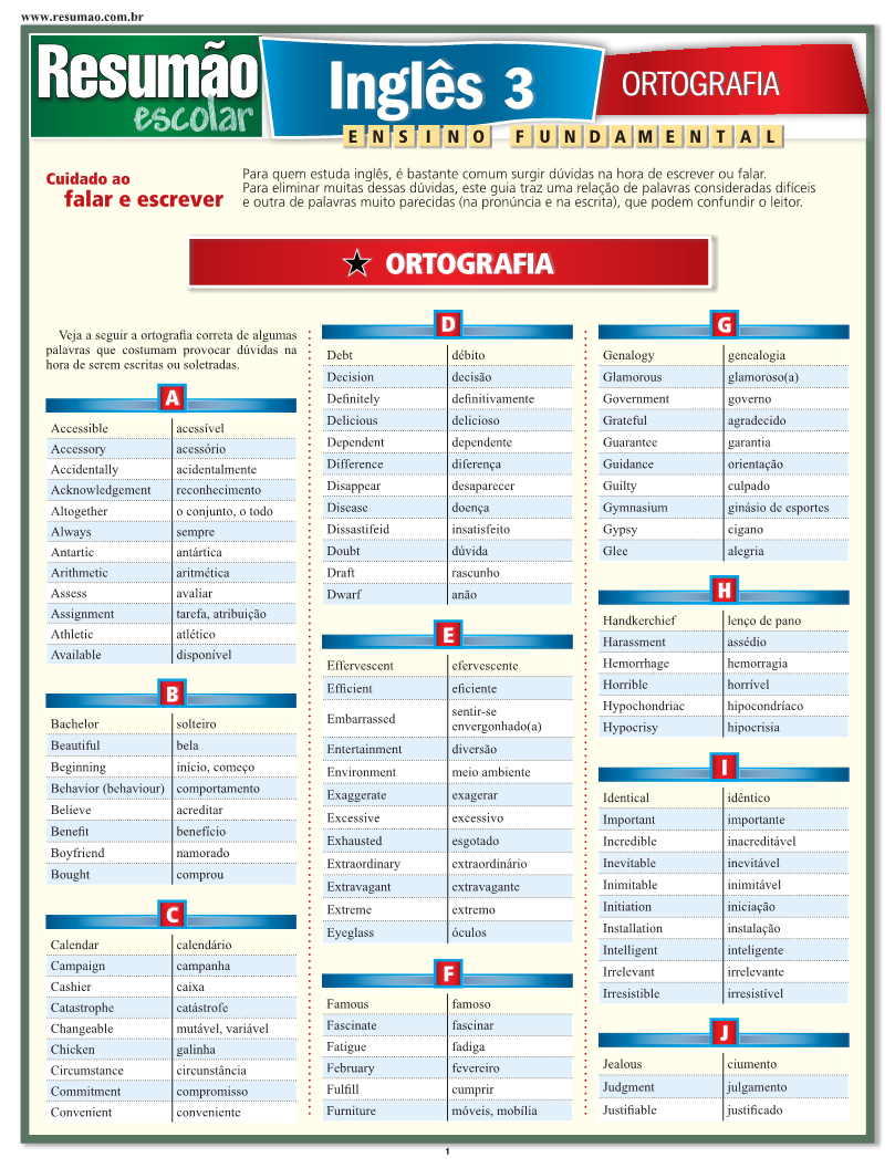 Este Resumão traz a grafia correta e o significado em português de algumas palavras que costumam provocar dúvidas nos estudantes. Além disso, uma lista de palavras que são semelhantes na escrita e/ou na pronúncia e que geram dúvidas na hora de serem aplicadas. | Autor: Steven Berner