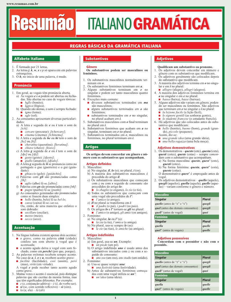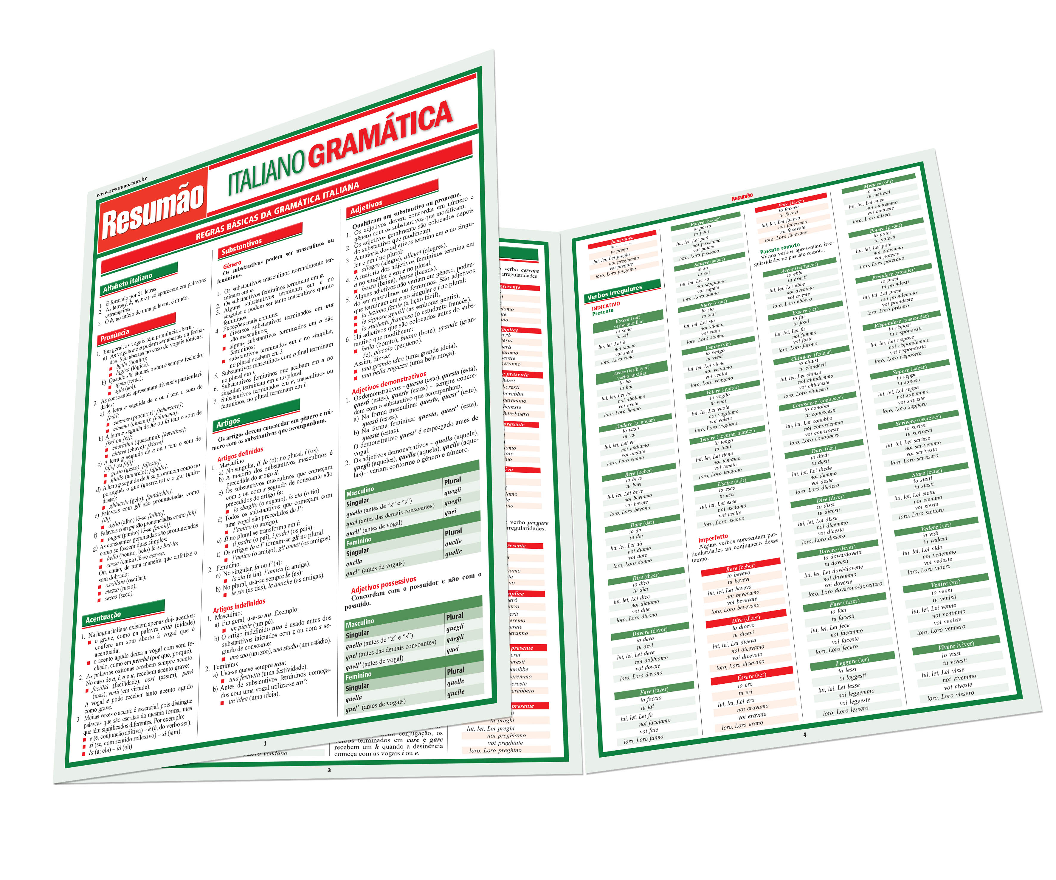 Neste Resumão você encontra as regras básicas da gramática italiana. Alfabeto, pronúncia, acentuação, substantivos, artigos, adjetivos, advérbios, preposições, pronomes, e números. Uma boa parte deste título aborda o uso dos verbos na língua italiana: modos verbais, verbos auxiliares nos tempos compostos e o uso dos modos, tempos e formas verbais. | Autora: Liliane Arnet | Páginas: 6