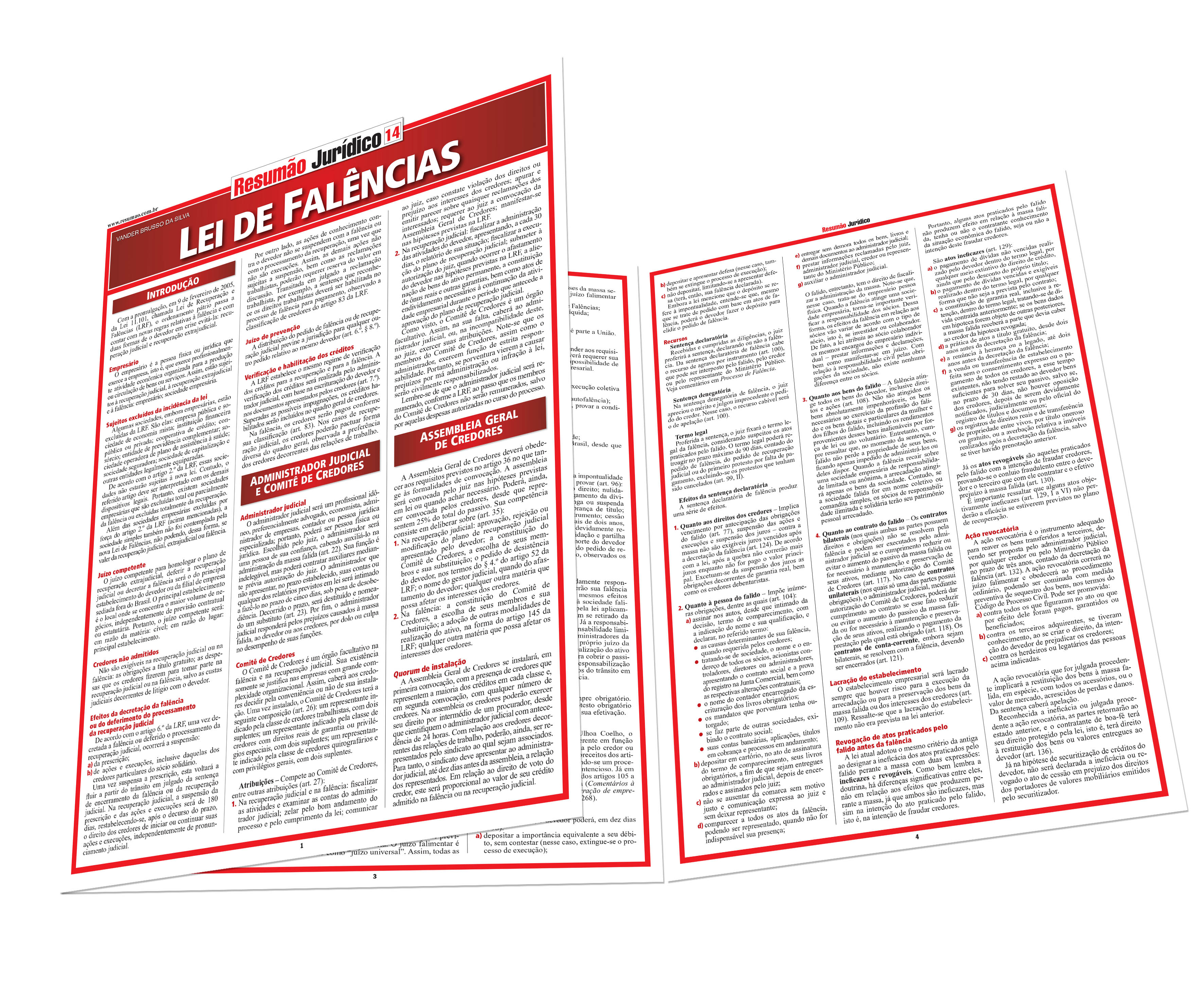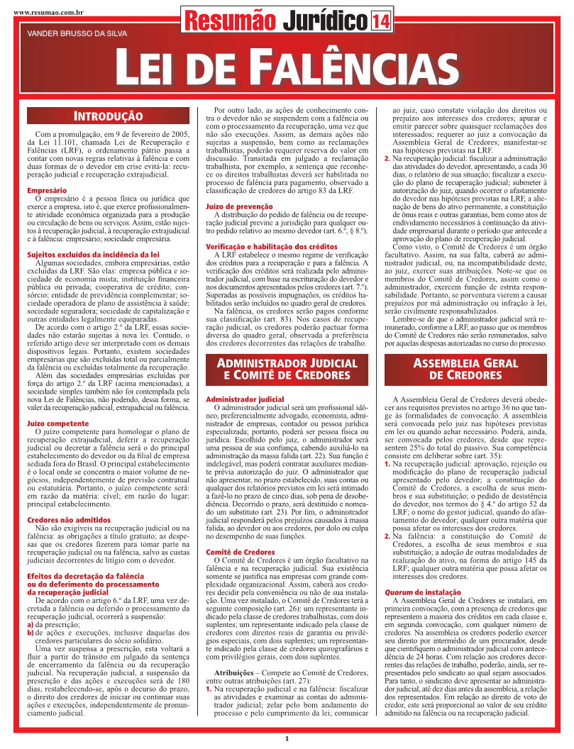 As regras relativas à falência (Lei 11.101/05), que criou a recuperação judicial e a recuperação extrajudicial. Administrador judicial e comitê de credores. Assembleia geral de credores. Recuperação judicial: requisitos, fases do processo, plano de recuperação judicial. A recuperação judicial para microempresas e empresas de pequeno porte. Convolação da recuperação judicial em falência. Falência: sujeitos da falência, rito falimentar, ação revocatória, encerramento da falência. Recuperação extrajudicial. O processo de falência: do juízo competente à extinção do processo e reabilitação do falido.