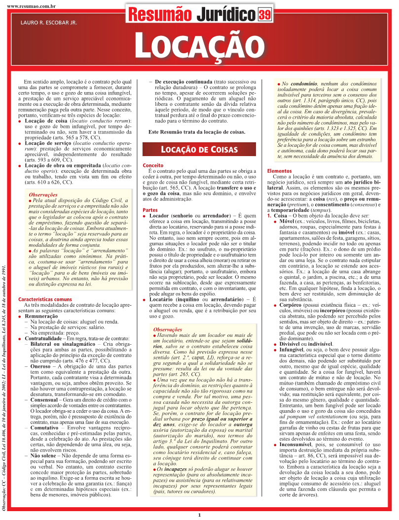 O que é e quais são as espécies de locação. Características comuns entre as três modalidades. Locação de coisas. Locação no Código Civil. Direitos e deveres do locador e do locatário. Locação de imóvel urbano (garantias e fiança). Locação residencial. Locação comercial ou empresarial. Transferência do contrato. Extinção da locação de coisas. E ainda: um quadro com as principais dúvidas sobre locação.