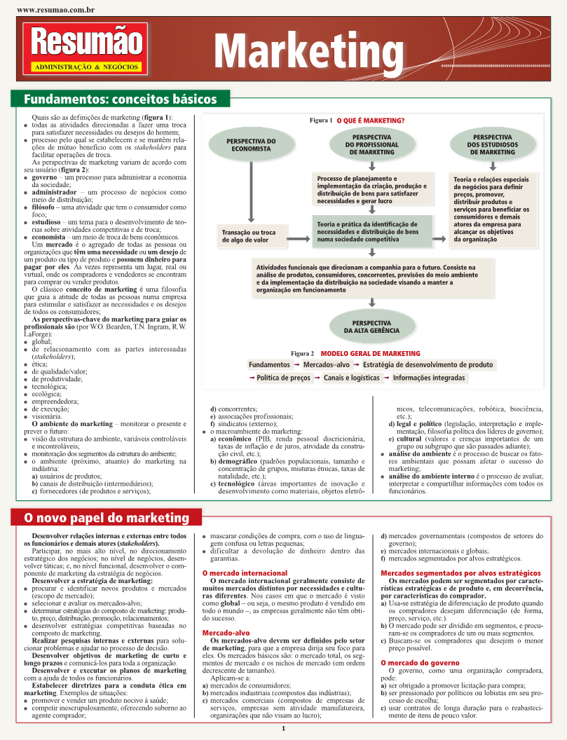 Fundamentos e conceitos básicos do marketing. O modelo geral e o novo papel do marketing. Mercado internacional, mercado-alvo, mercados segmentados e o mercado do governo. Produtos: desenvolvimento e ciclo de vida; o processo de adoção de um produto; marcas e mix de produtos. Comunicação em marketing. Venda direta ou pessoal. Gerenciando a força de venda. Propaganda, promoção de vendas, relações públicas. Distribuição: canais de distribuição, varejo, atacado, administração da logística de marketing. Processo de decisão de compra. Pesquisa de mercado. Determinação do preço.