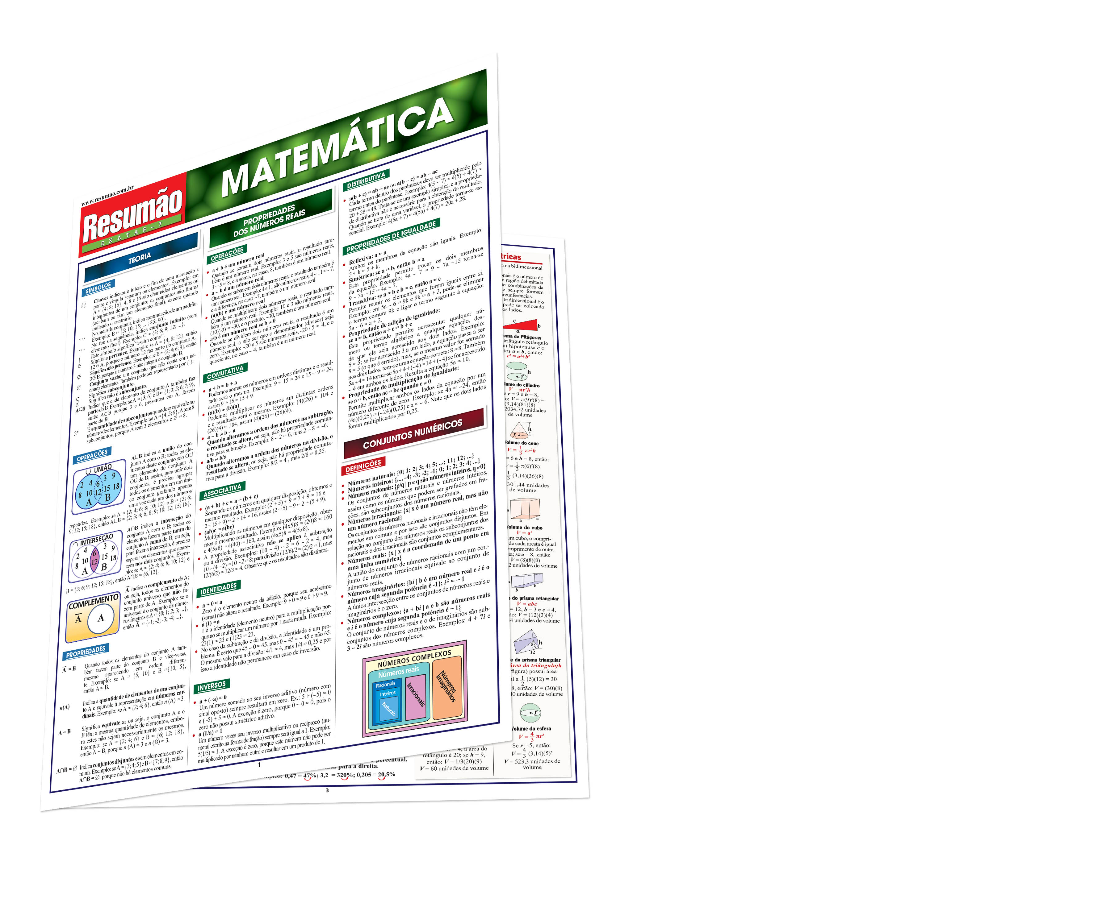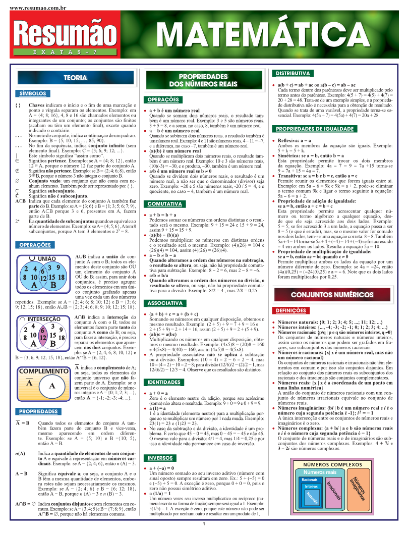 Propriedades dos números reais. Conjuntos numéricos. Operações com números reais: teorema fundamental da aritmética, ordem das operações, números decimais, números decimais na forma de fração, adição, subtração, multiplicação e divisão. Números negativos. Frações: simplificação, adição, subtração, multiplicação, divisão. Números mistos e frações impróprias. Razão, proporção e porcentagem. Fórmulas geométricas. Álgebra: propriedade distributiva dos polinômios, combinação, adição, subtração, potenciação, inequação. Fórmulas para aplicação de porcentagem.