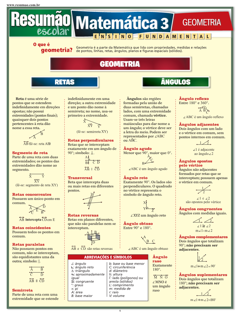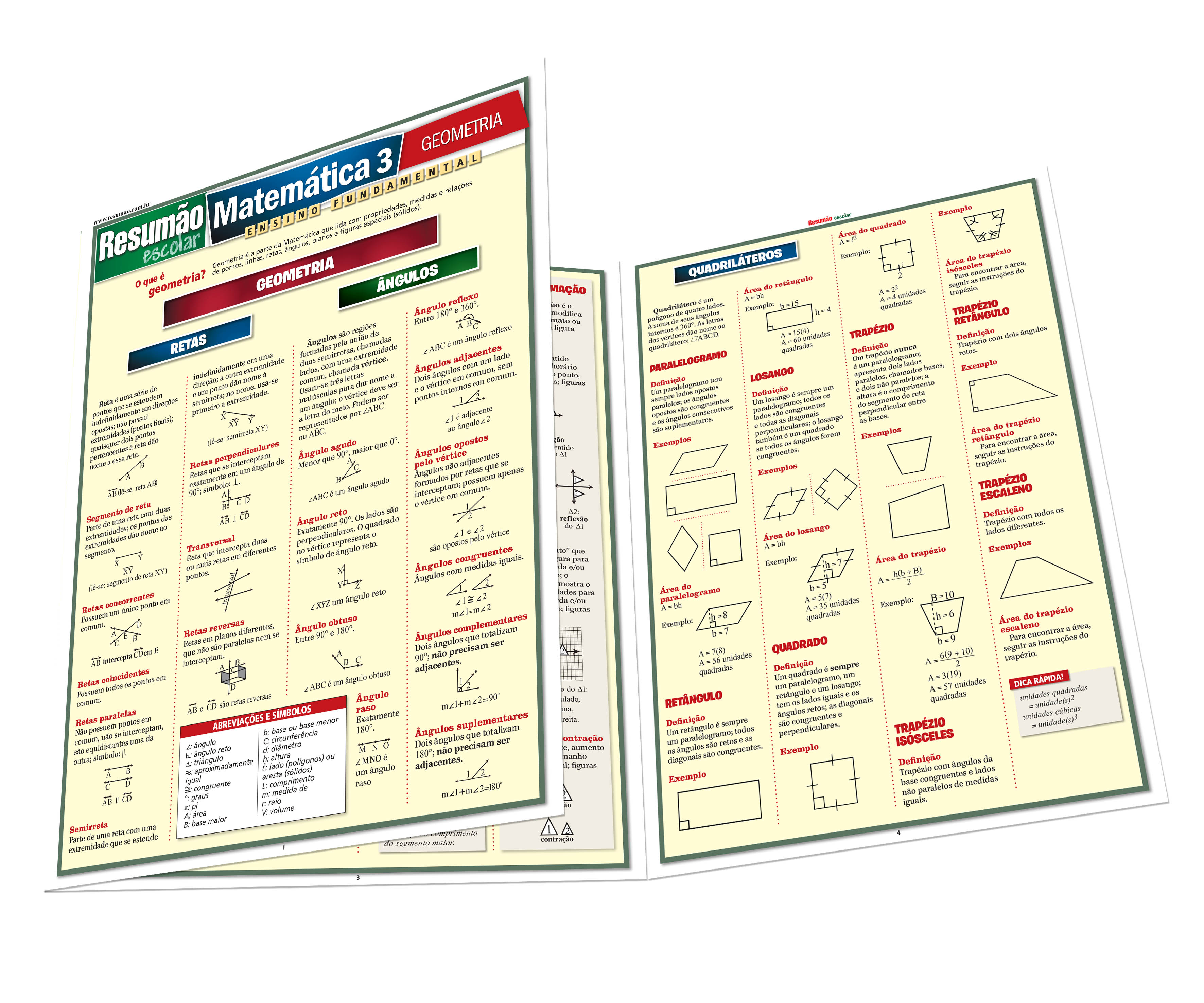 Este Resumão traz os conceitos básicos da geometria: retas, ângulos, polígonos, triângulos, quadriláteros, círculos, elipses e sólidos (poliedros, prismas, pirâmides e sólidos com superfícies curvas). Você encontra ainda as definições e os tipos de retas, ângulos e polígonos, além da classificação dos triângulos e dos quadriláteros (paralelogramo, retângulo, losango, quadrado e trapézio), entre outros. | Autores: Peggy Warren e Susan Wright