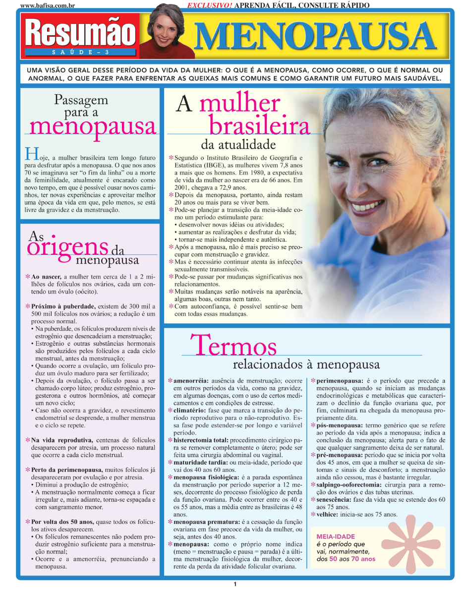 Uma visão geral desse período da vida da mulher: o que é a menopausa, como ocorre, o que fazer para enfrentar as queixas mais comuns e garantir um futuro mais saudável. Passagem para a menopausa. Mudanças físicas graduais. O processo normal de envelhecimento. Influências na meia-idade. Três passos para diagnosticar a menopausa. Sinais de alerta e sintomas. Medidas de precaução que você pode adotar. Doenças comuns na meia-idade. Dúvidas sobre a terapia de reposição hormonal na menopausa. Sexualidade e intimidade. | Autora: Ellis Quinn Youngkin, Ph.D.
