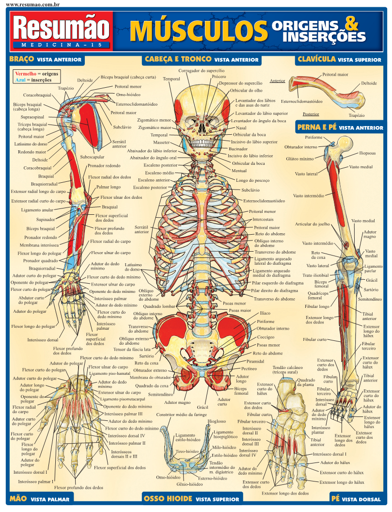 Quatorze excelentes e detalhadas ilustrações sobre a origem e inserções dos músculos, com centenas de identificações anatômicas. Vistas anterior e posterior da cabeça e do tronco. A base do esqueleto. Vista superior do osso hioide. Vistas superior e inferior da clavícula. Vistas anterior e posterior do braço. Vistas anterior e posterior da perna e do pé. Em detalhes: vista palmar e dorsal da mão, vistas dorsal e plantar do pé.