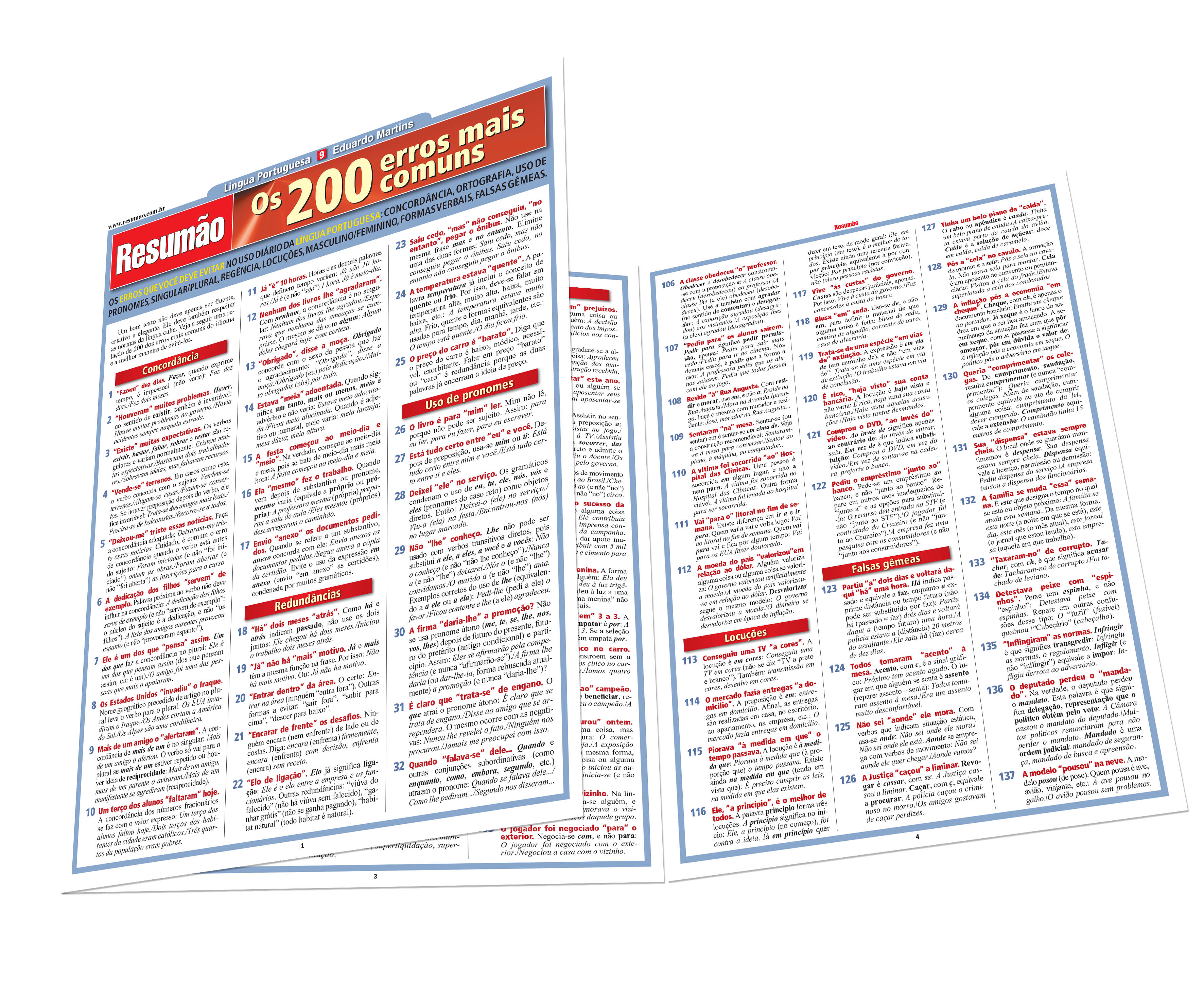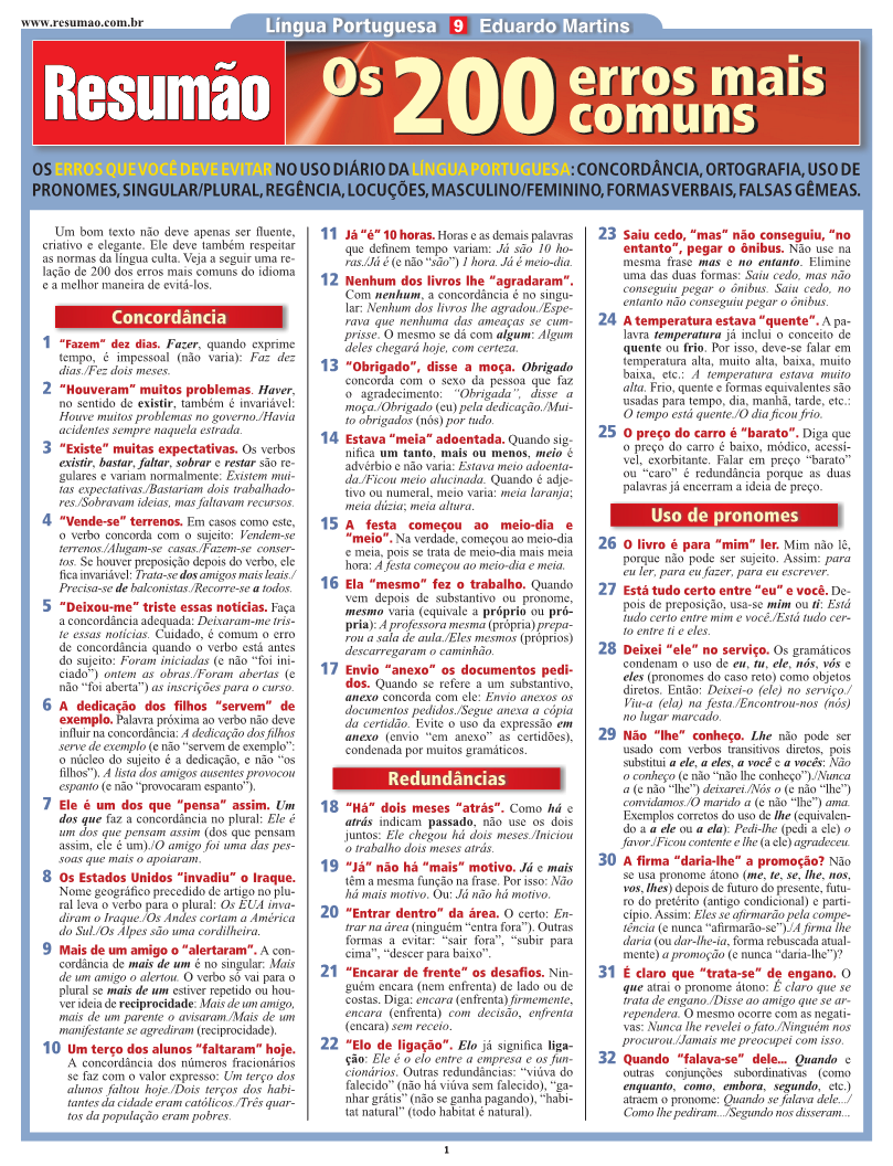 O Resumão Os 200 Erros Mais Comuns é um guia prático que enumera os erros que você deve evitar no uso diário da língua portuguesa. Erros de concordância, redundâncias, uso de pronomes, singular e plural. Os erros mais frequentes de ortografia, de acentuação e do uso do hífen. Erros de regência, o uso incorreto de locuções e as falsas gêmeas. As formas verbais; masculino e feminino. Palavras mal-usadas e o uso da crase. Destaque para uma lista de 14 erros que você deve evitar a todo custo. Atualizado de acordo com as novas regras de ortografia.
