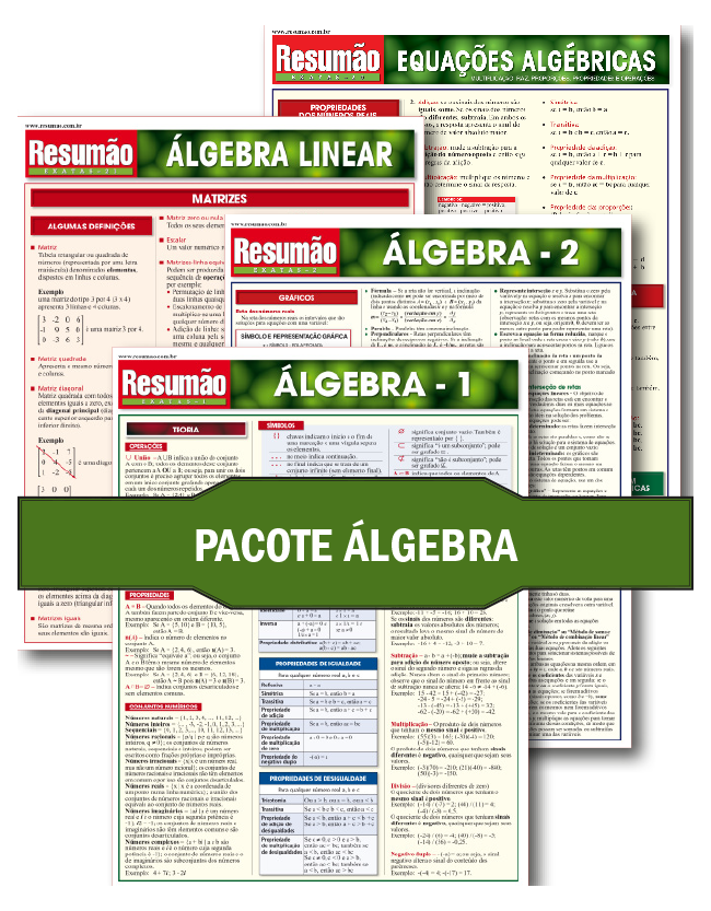 É outro pacotão temático, com os Resumões Álgebra 1, Álgebra 2, Álgebra Linear e Equações Algébricas. Eles conseguem oferecer uma visão ampla da matéria, cobrindo os principais pontos, explicando conceitos fundamentais e ajudando a resolver equações e problemas. Ótimos para consultar, rever a matéria e estudar para as provas.