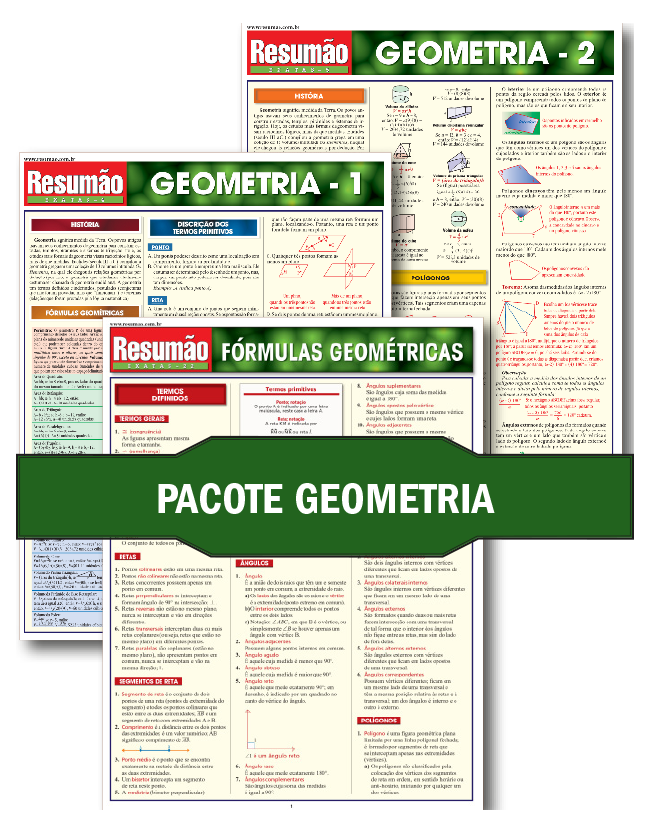 Os Resumões Geometria 1, Geometria 2 e Fórmulas Geométricas formam esse pacote que traz um retrato amplo da matéria que estuda as formas e figuras. As fórmulas geométricas explicadas de maneira simples para entender e consultar sempre que preciso completam o trio de Resumões.