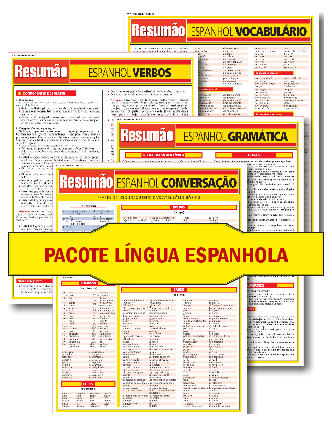 Quatro títulos de língua espanhola formam esse kit, que é excelente para quem estuda, para quem ainda quer aprender e para quem já sabe, mas precisa tirar uma dúvida de vez em quando. Os Resumões Espanhol Gramática, Espanhol Verbos, Espanhol Vocabulário e Espanhol Conversação trazem uma visão geral da língua – e integram esse pacote com um preço especial!
