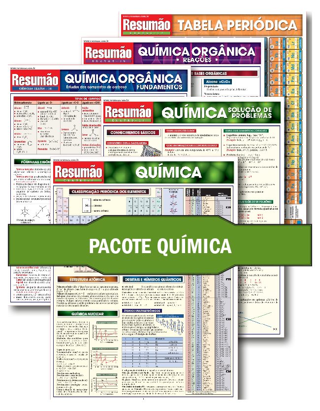 Esse é um pacotão completo, com todos os Resumões da matéria: Química, Química Solução de Problemas, Química Orgânica Fundamentos, Química Orgânica Reações e ainda a Tabela Periódica para você consultar sempre que precisar quando for estudar a matéria. Tudo isso, claro, com um desconto especial!