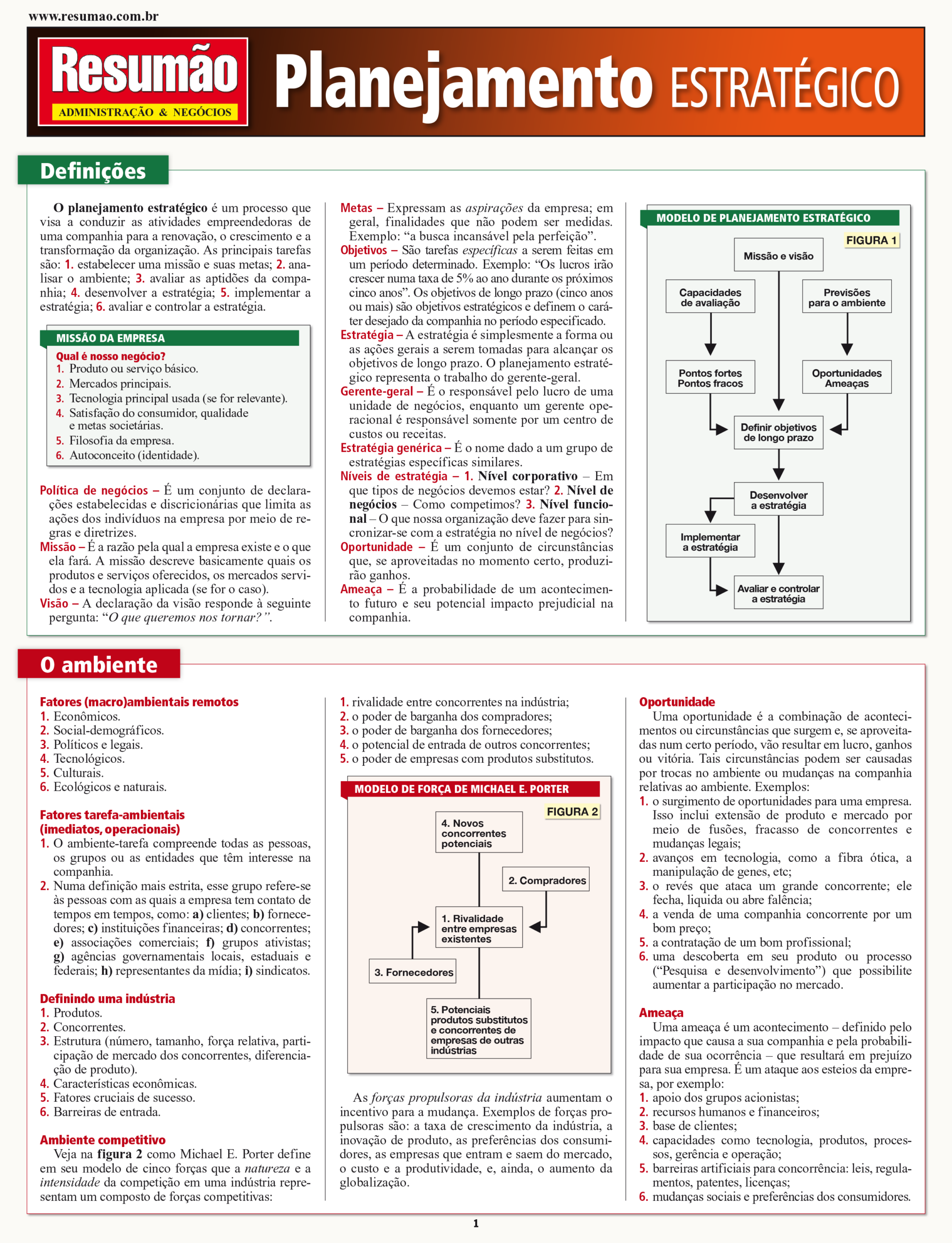 Objetivos do planejamento estratégico. Modelo de planejamento estratégico. Análise do ambiente. Análise das capacidades da companhia. Formulação da estratégia corporativa: objetivos, escolha das estratégias, análise e avaliação do portfólio, seleção de estratégias genéricas e específicas, ciclo de vida do produto e análise da estratégia. Estratégias empresariais para unidades de negócios ou empresas de um único produto. Implementando a estratégia. Fundamento para a avaliação da estratégia.