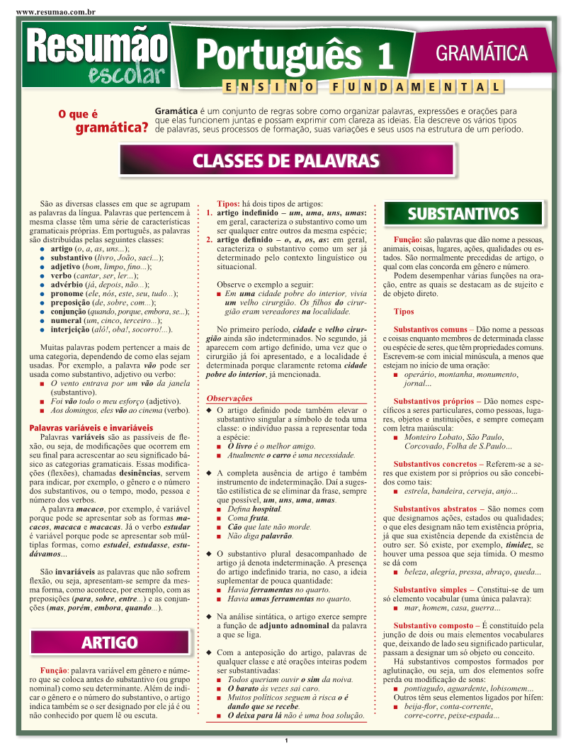 Este guia explica quais são as classes de palavras, suas funções, tipos, as flexões, os graus e o plural. No [Português 1], você encontra as principais informações sobre artigo, substantivos, adjetivos e verbos. Além das regras fundamentais sobre cada classe de palavra, notas e observações simplificam o entendimento e o uso correto da nossa língua. O Resumão Escolar Português 2 completa este título na abordagem dos principais pontos da morfologia lecionados no ensino fundamental de português. | Autor: Odilon Soares Leme | Páginas: 6